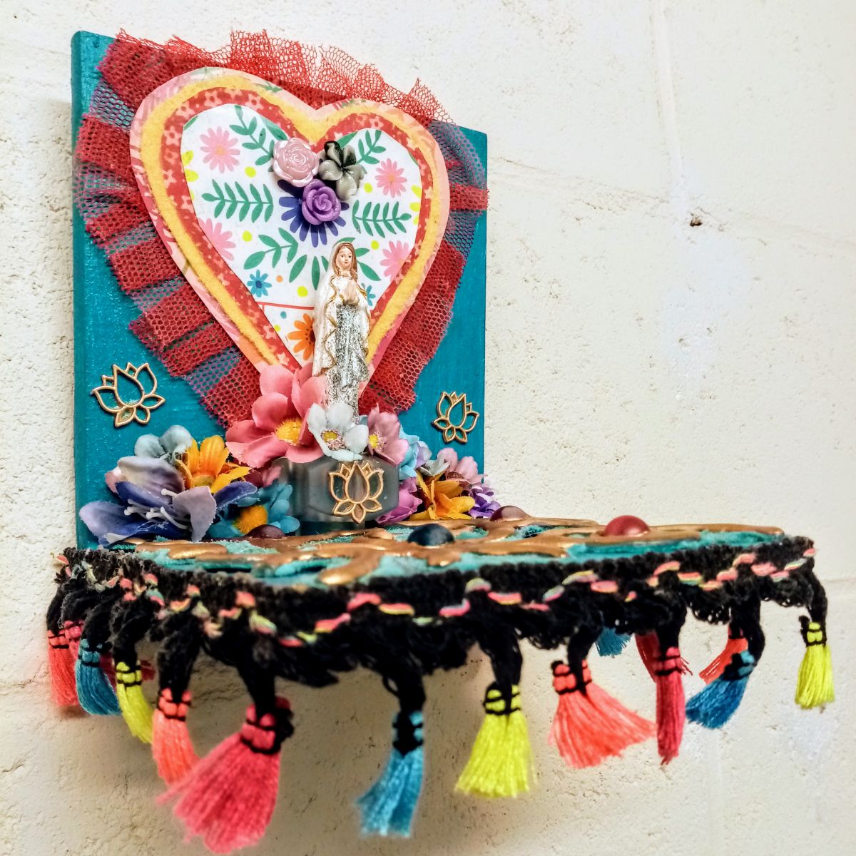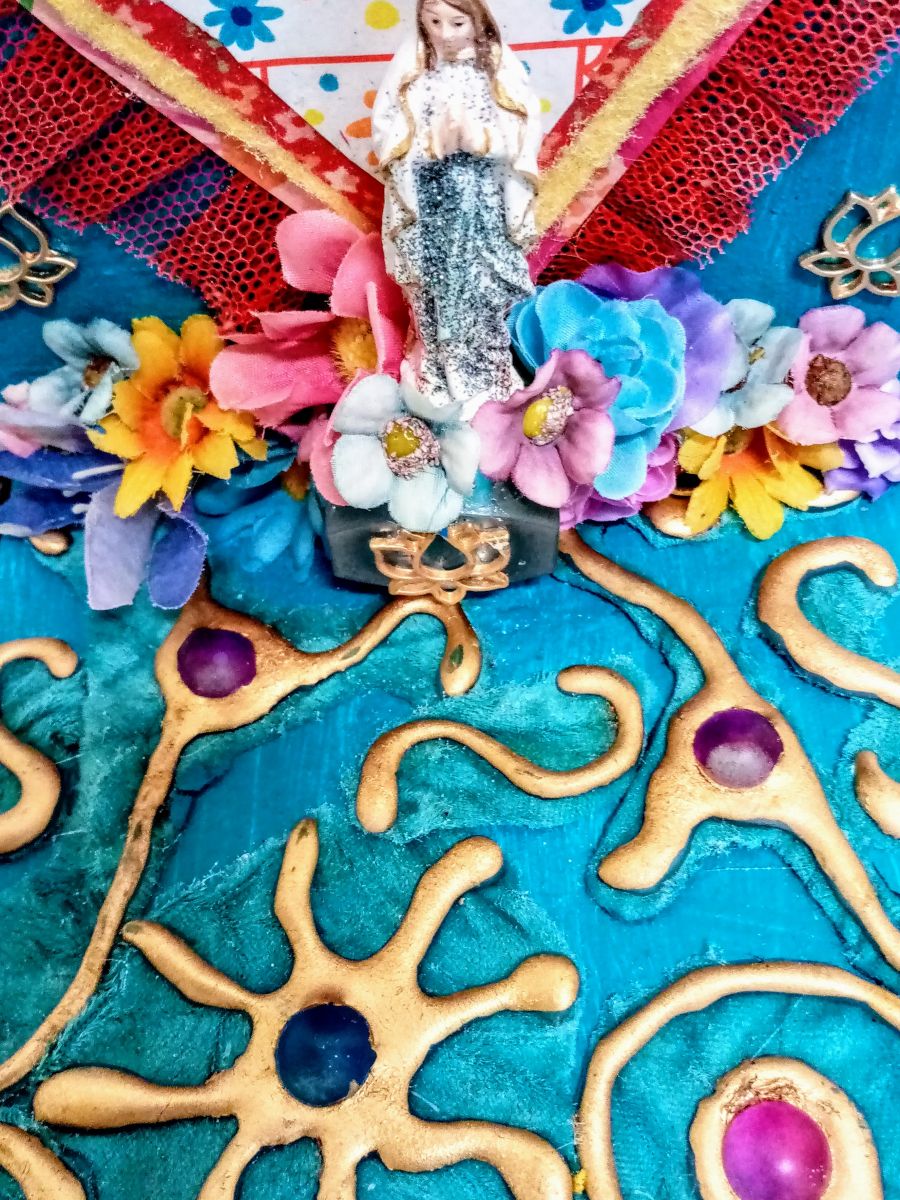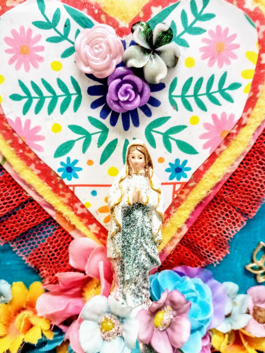Jolie petite niche religieuse avec la vierge Marie en son centre, à suspendre au mur pour créer un espace béni, de recueillement, un sanctuaire qui est aussi décoratif et coloré par l'assemblage des symboles de vie qui le garnissent.