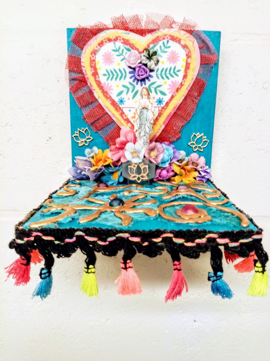 Posée sur un socle en bois peint et verni, travaillé dans un style kitsch avec amour et soin du détail, la Vierge entourée de cœurs en tissus, de fleurs et de motifs colorés, symbolise de façon inédite, sérénité et sagesse et créera un endroit de recueillement rempli d'amour, On aura envie d'y faire la prière du soir avec les plus jeunes. Cette décoration religieuse peut être offerte à l'occasion d'un baptême, d'une communion ou d'une confirmation et plaira aussi aux enfants.