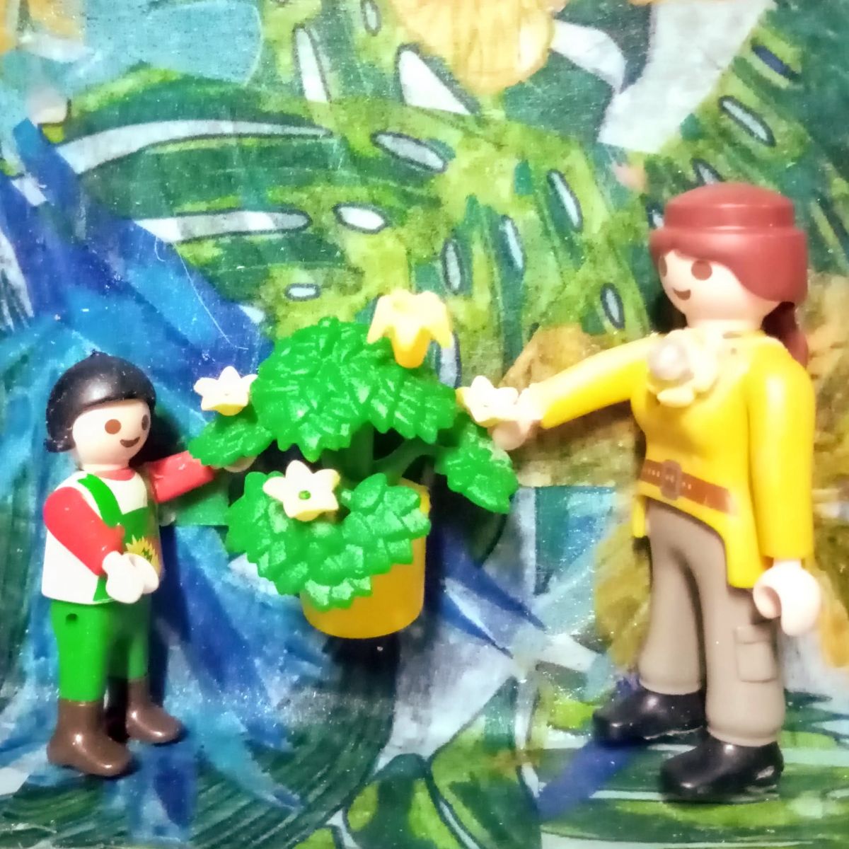 Dans un monde imaginaire, c'est jour de fête et on découvre une fillette et sa sœur ou sa maman, sa marraine, son amie ou encore un membre de la famille, une fleur sur le polo et un collier autour du cou. Sur un joli fond végétal, elles s'échangent une belle plante en pot au milieu du cadre bleu.