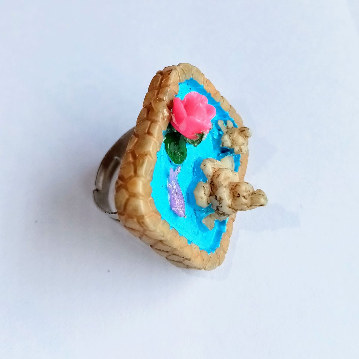 Voici une collection de bagues uniques constituées d'un anneau argenté, réglable, pour adulte ou pour enfant avec un étang féerique miniature carré.