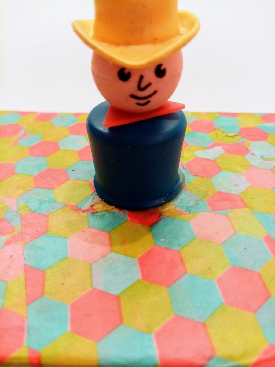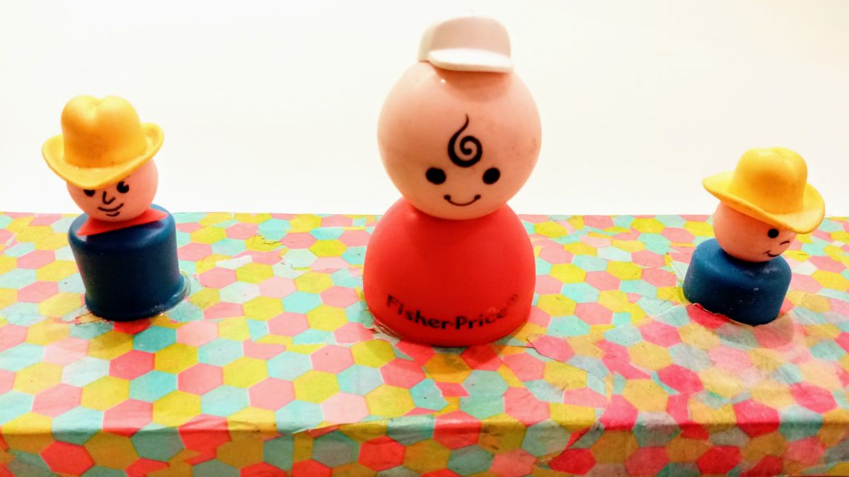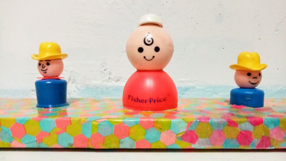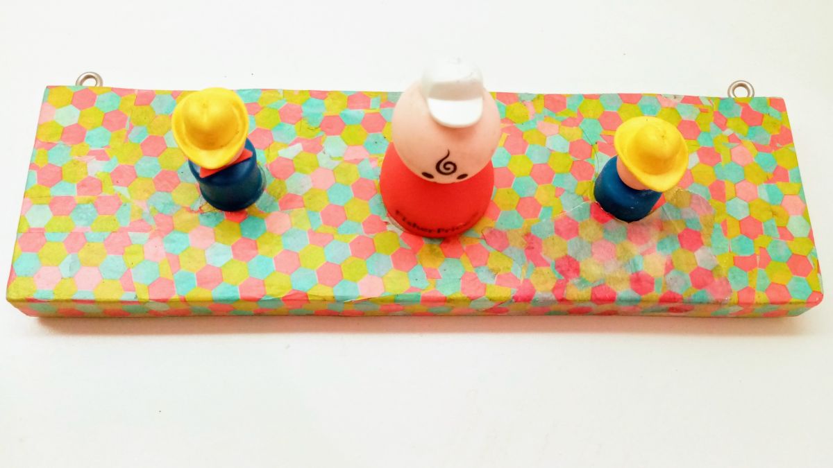 Un support a vêtements en bois à motifs vernis et trois figurines Little People vintages qui font office de crochets.