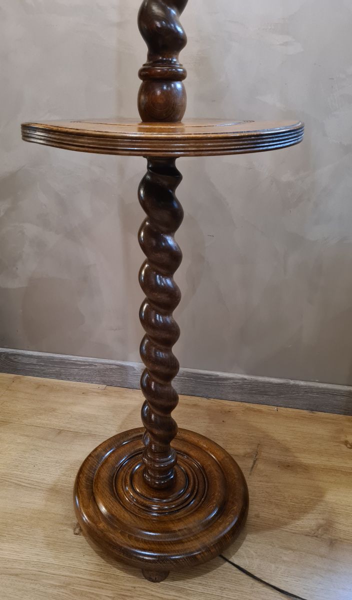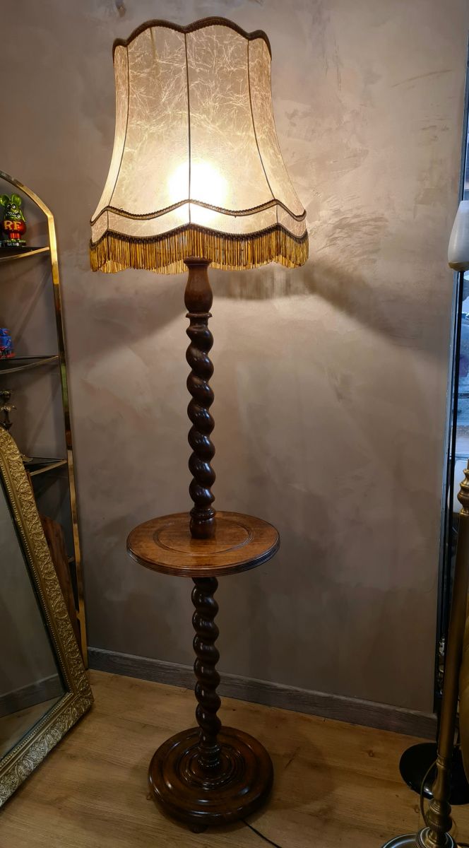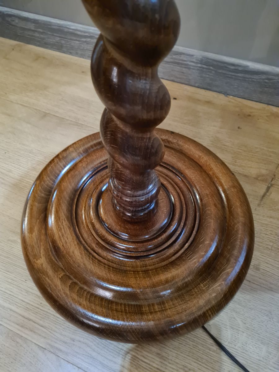 lampadaire en bois tourné (noyer). Bon état. avec grand abatjour tres beau