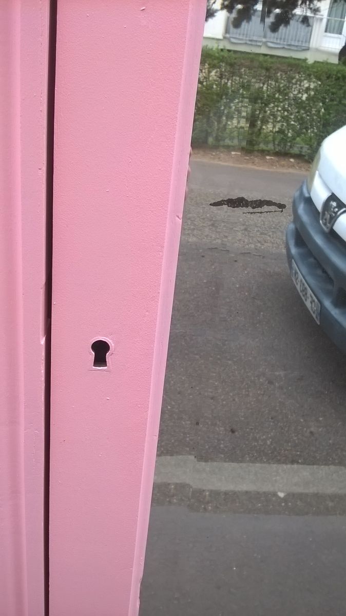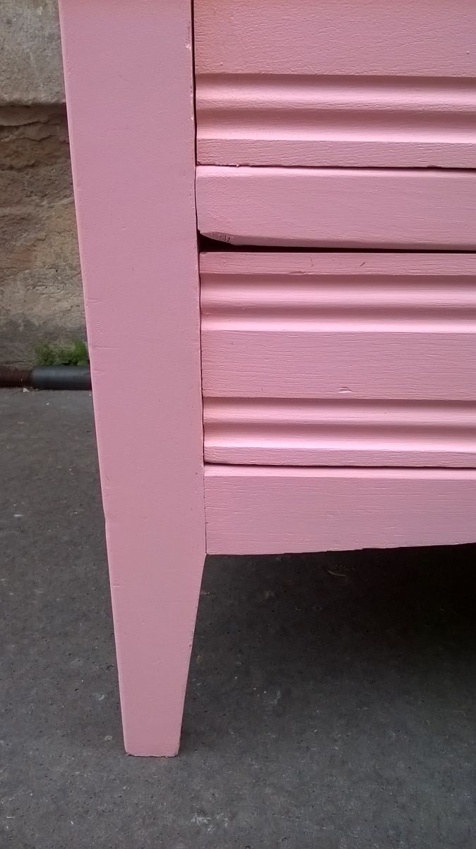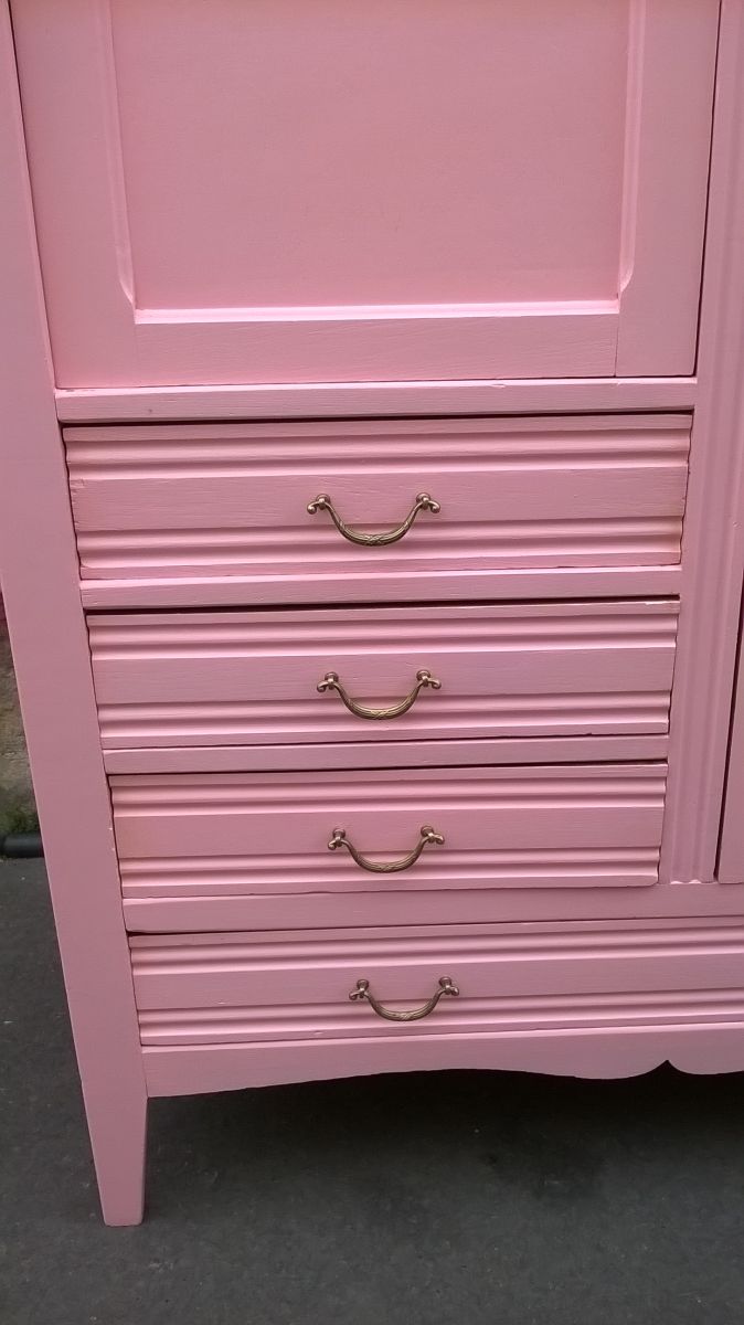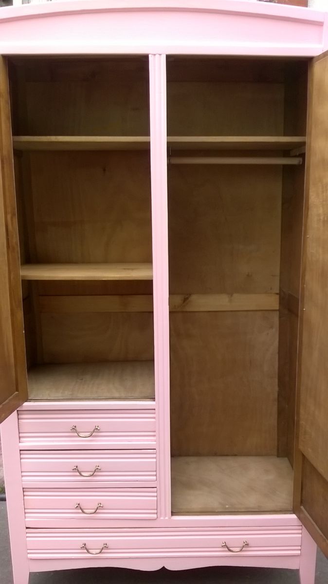 Armoire parisienne année 30. Elle a été poncer et repeint en rose. Coté penderie et coté étagère. La serrure du coté étagère fonctionne, l autre ne fonctionne pas. Trois tiroir et un grand, poignée en laiton d origine.