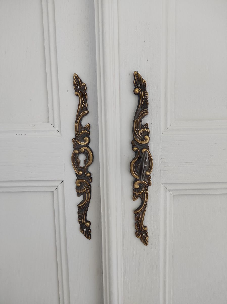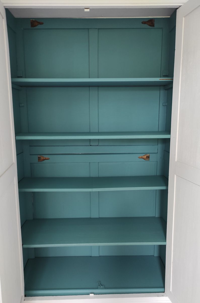 Armoire ancienne en bois repeinte en blanc légèrement grisé à l'extérieur et en bleu/vert à l'intérieur, tout en laissant apparaître les traces du passé.