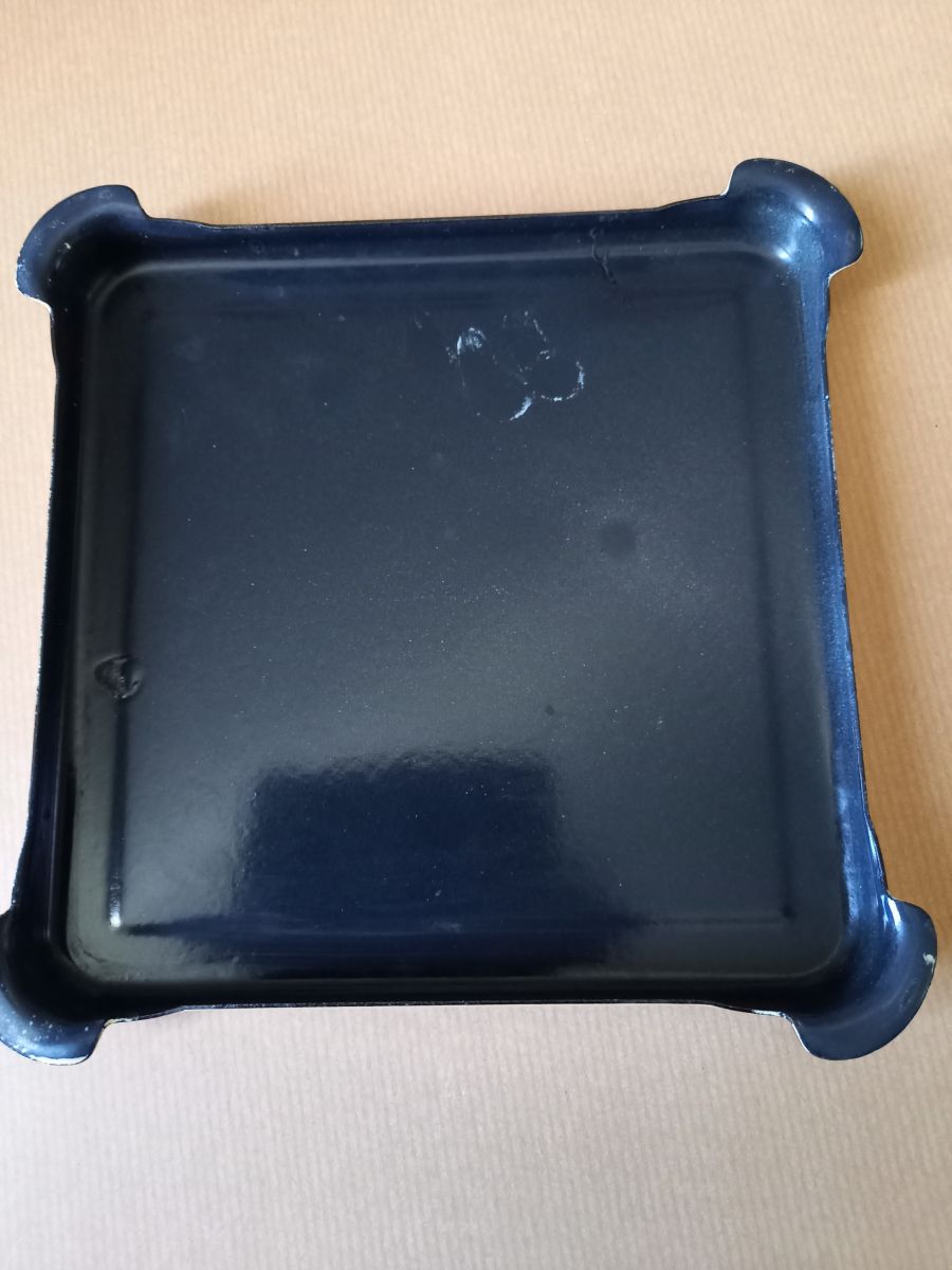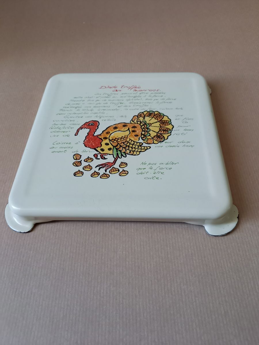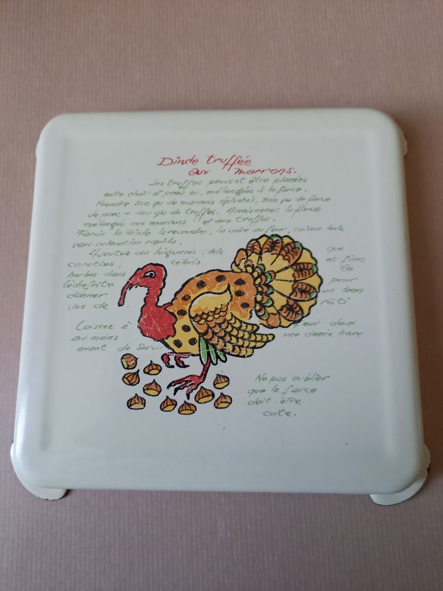 Dessous de plat vintage en métal émaillé de couleur crème. Motif :recette ancienne de dinde truffée aux marrons. Original et rétro. Beaucoup de charme. Idéal pour une cuisine de campagne.