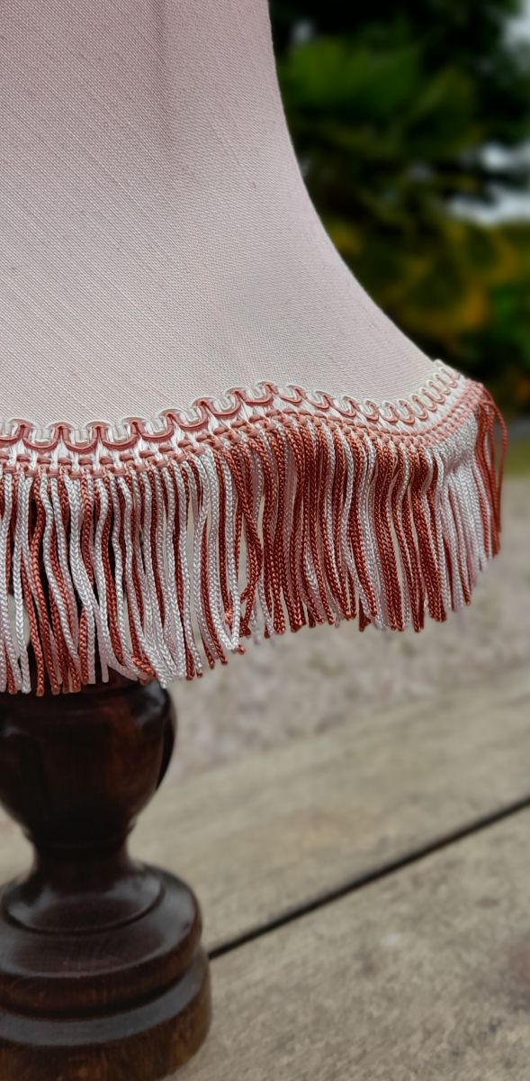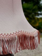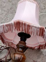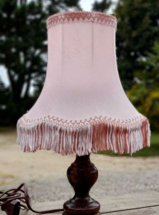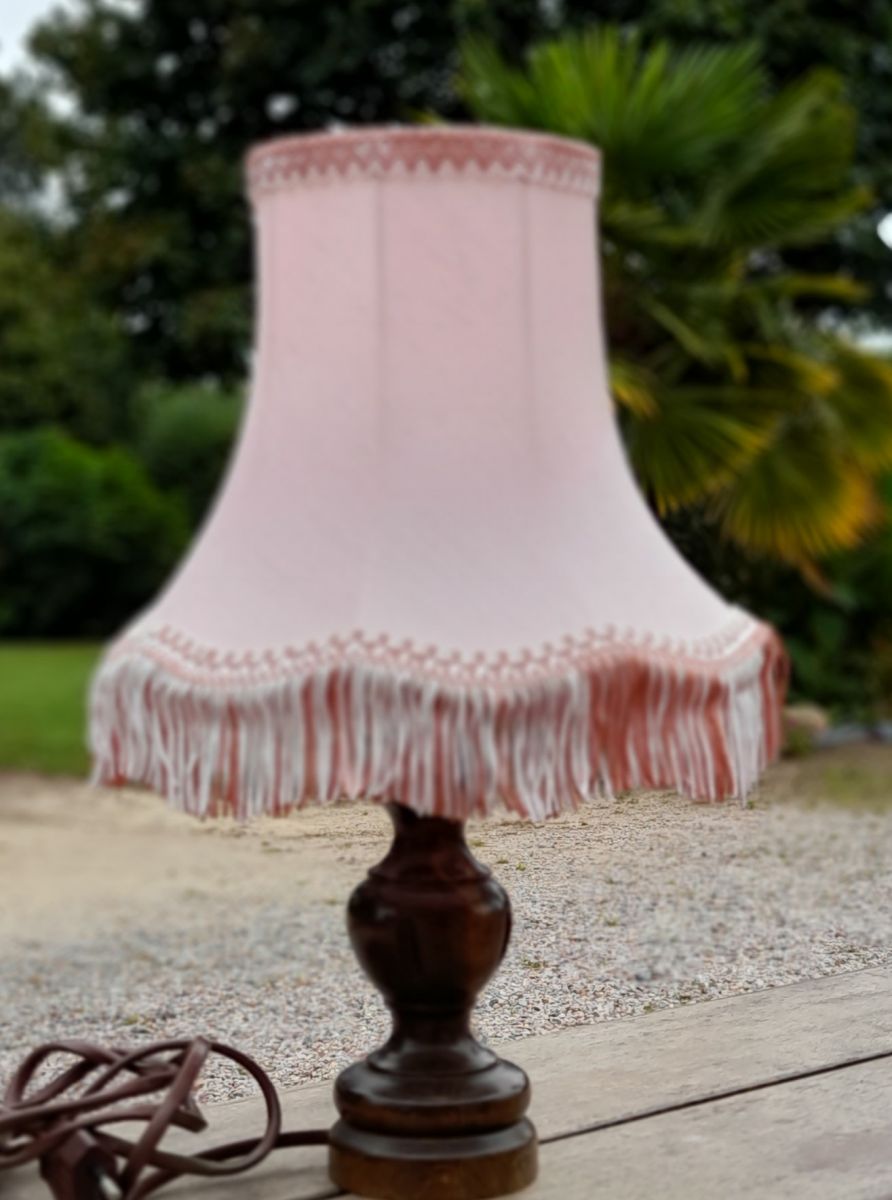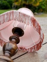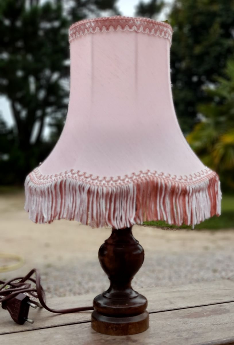 Charmante petite lampe de chevet/de table, pied bois tourné massif teinté foncé avec son abat-jour festonné en tissu rose clair à franges forme tulipe et bordures recouvertes de galon rose et blanc, armature blanche, style victorien, en très bel état. Hauteur de l'ensemble 32 cm. Hauteur abat jour seul sans les franges 15 cm. Hauteur pied jusqu'à la douille à vis petit culot: 15.cm. Système électrique contrôlé, fonctionne parfaitement.