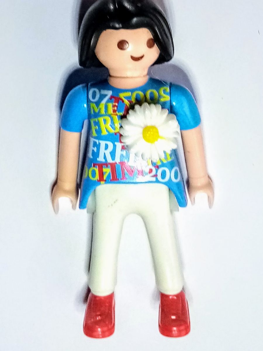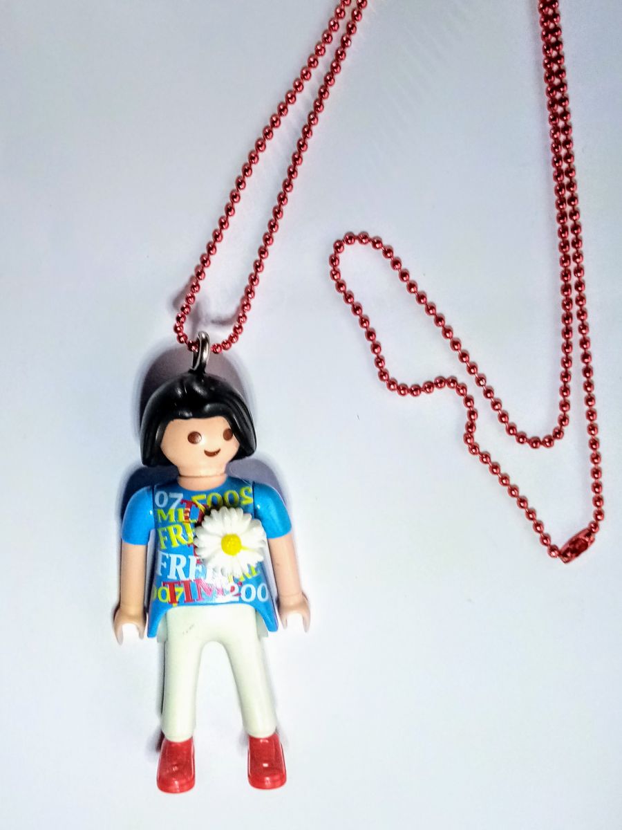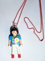 Ce collier de fantaisie a été réalisé en détournant une véritable figurine de dame Playmobil agrémentée de petits détails. Le pendentif de 7 cm est suspendu grâce à un tourniquet à vis argenté hypoallergénique à une chaîne à billes en acier colorée à connecteur de 70 cm ( il n'est donc pas nécessaire de l'ouvrir ). Ce bijou est présenté en pochette cadeau à ruban.