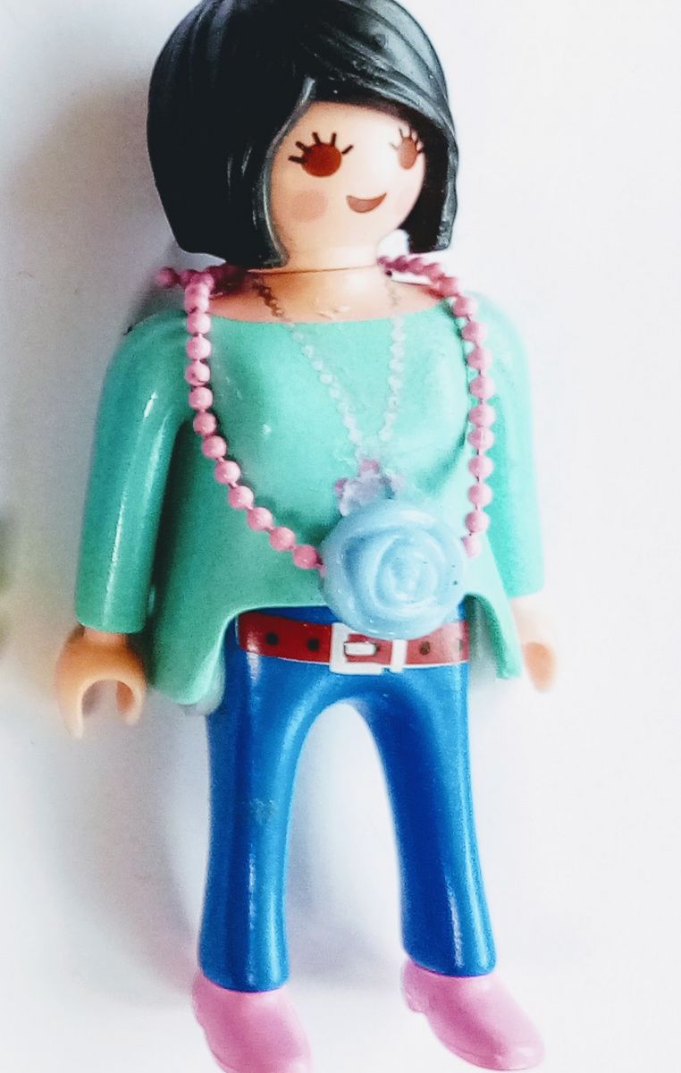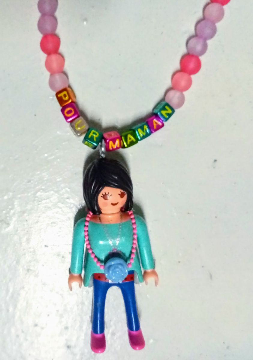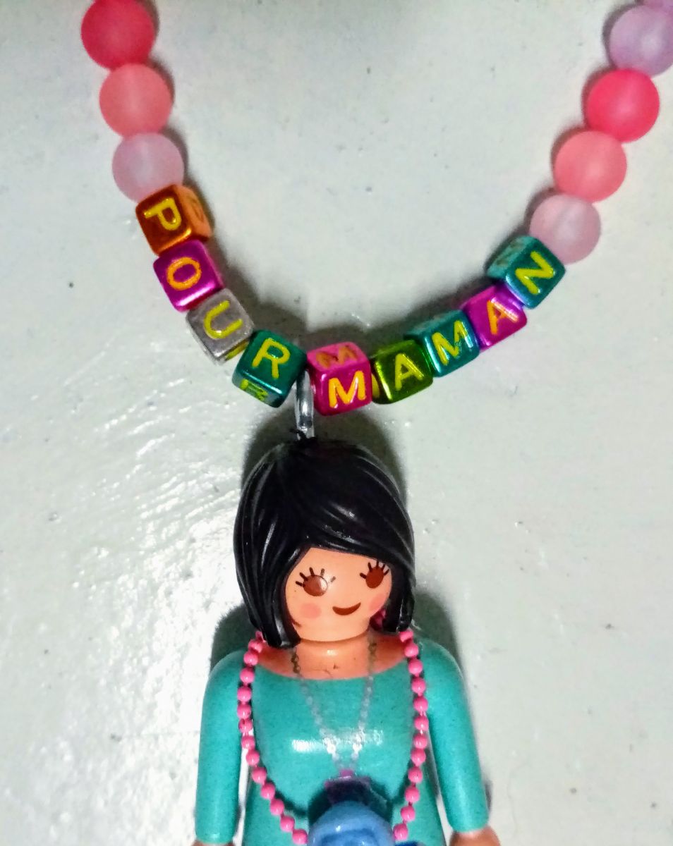 Ce collier de fantaisie a été réalisé en détournant une véritable figurine de dame Playmobil agrémentée de petits détails. Le pendentif de 7 cm est suspendu grâce à un tourniquet à vis argenté hypoallergénique à une chaîne à perles roses de 70 cm ( il n'est donc pas nécessaire de l'ouvrir ). Ce bijou est présenté en pochette cadeau à ruban.