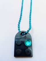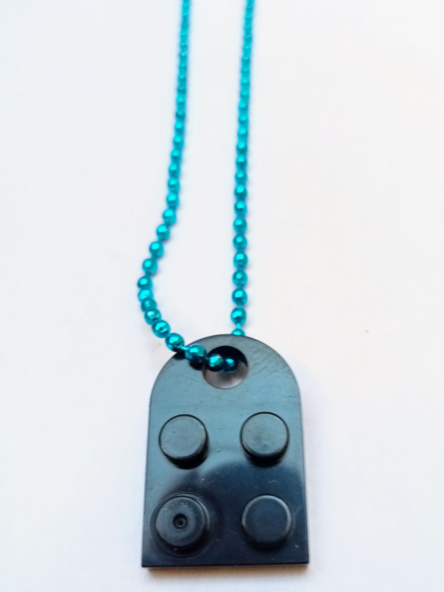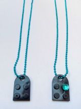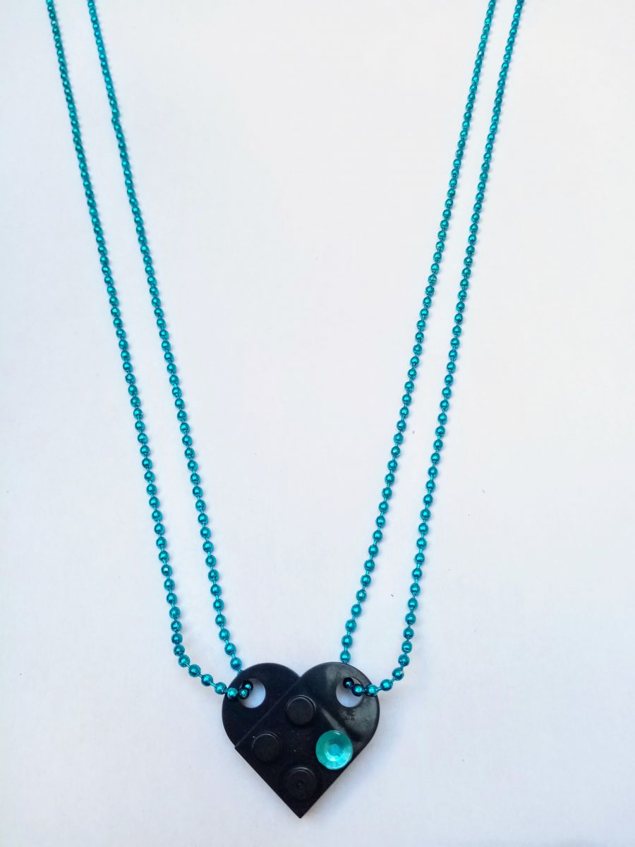 ICI: Un collier cœur Lego à partager en deux en signe d'amour, de lien familial ou d'amitié. Il y a deux colliers en un avec deux chaines à billes bleues et le pendentif cœur noir agrémenté d'un strass bleu, qui se divise en deux. Voilà donc deux bijoux symboliques à garder et à offrir.