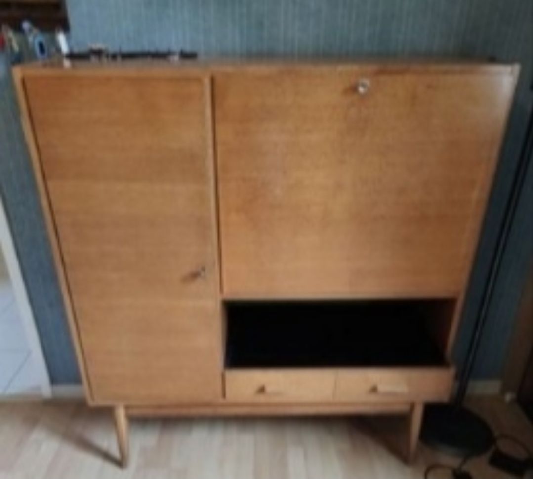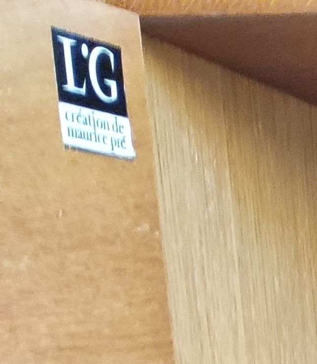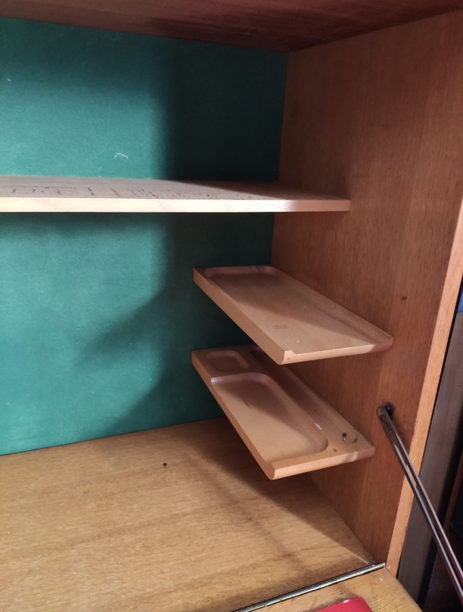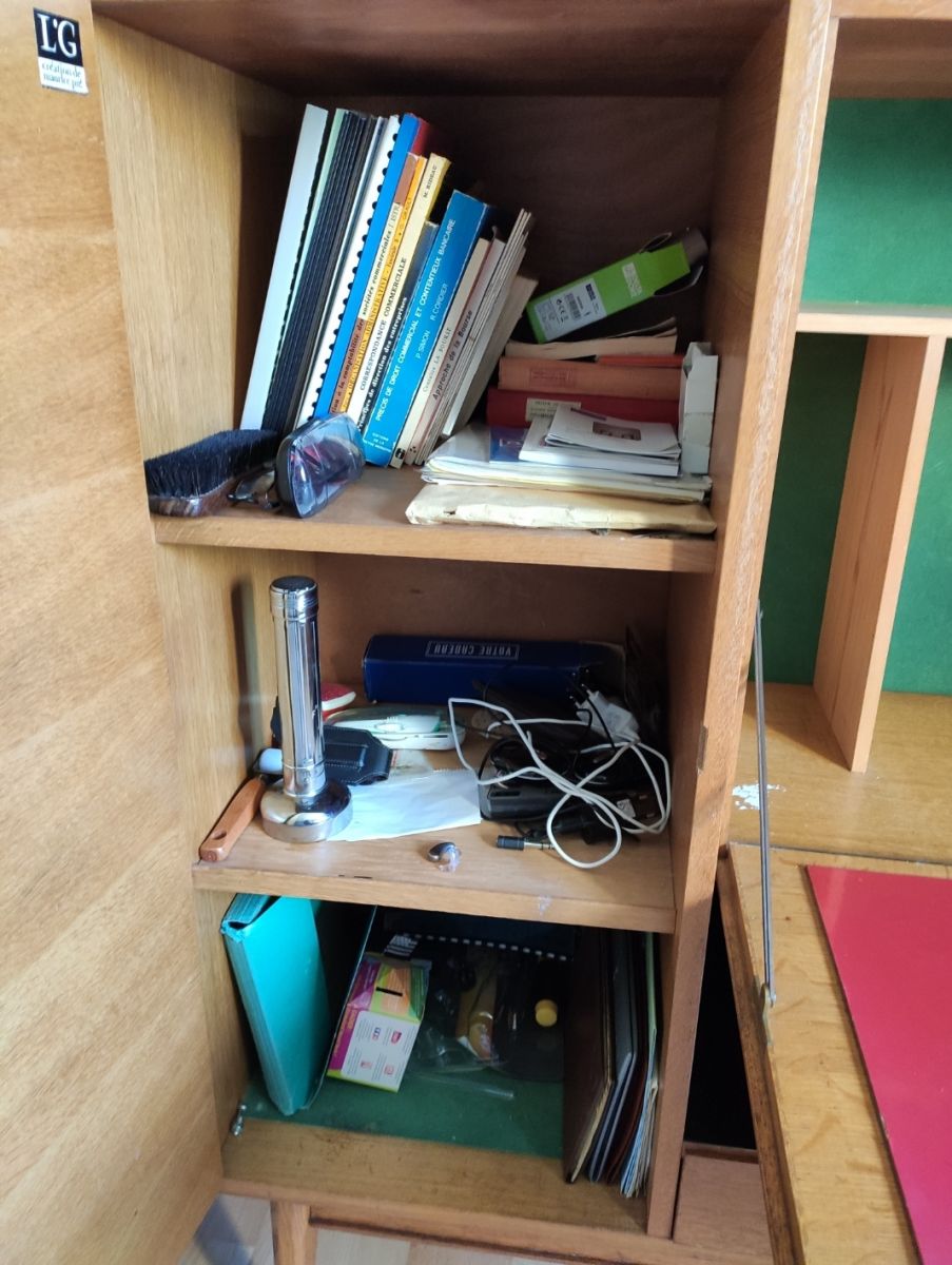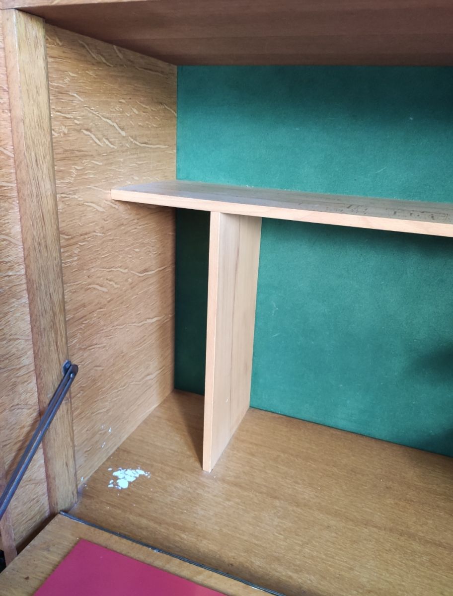 Secrétaire Maurice Pré années 50. En bois et chêne plaqué. L'intérieur avec petites étagères portes stylos, partie étagères et fond de la partie bureau recouverts du tissus vert d’origine. Une niche en plexi noir et une partie bureau en plexi rouge. 2 tiroirs