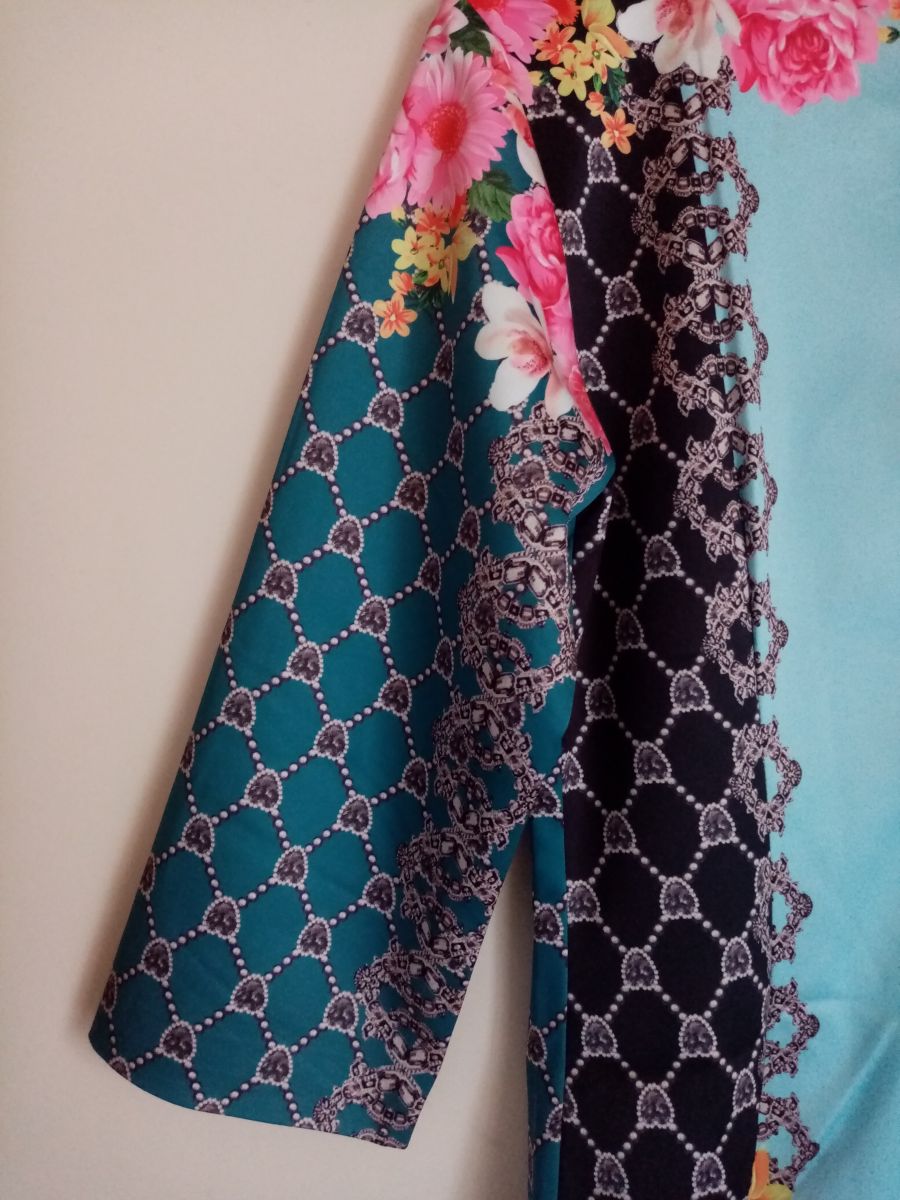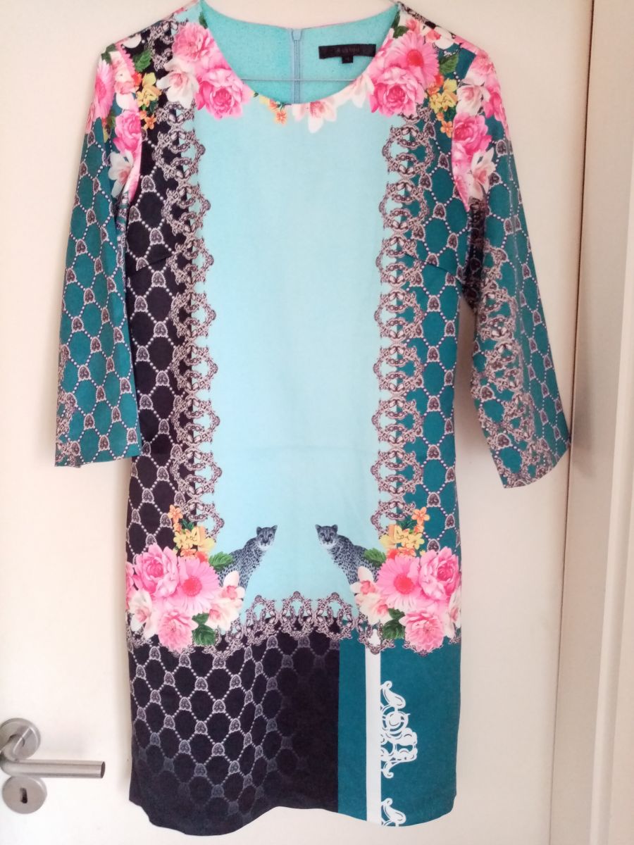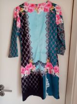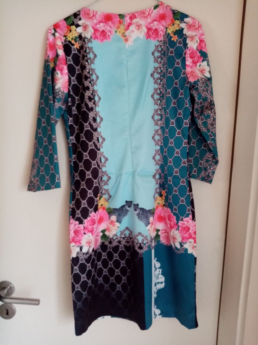 Jolie robe unique jamais portée car achetée trop petite. Fermeture à glissière dans le dos. Doublée en tissus bleu ciel. Se porte en toute circonstance.