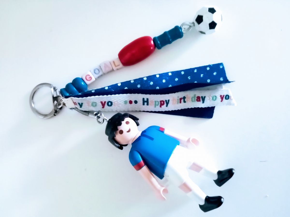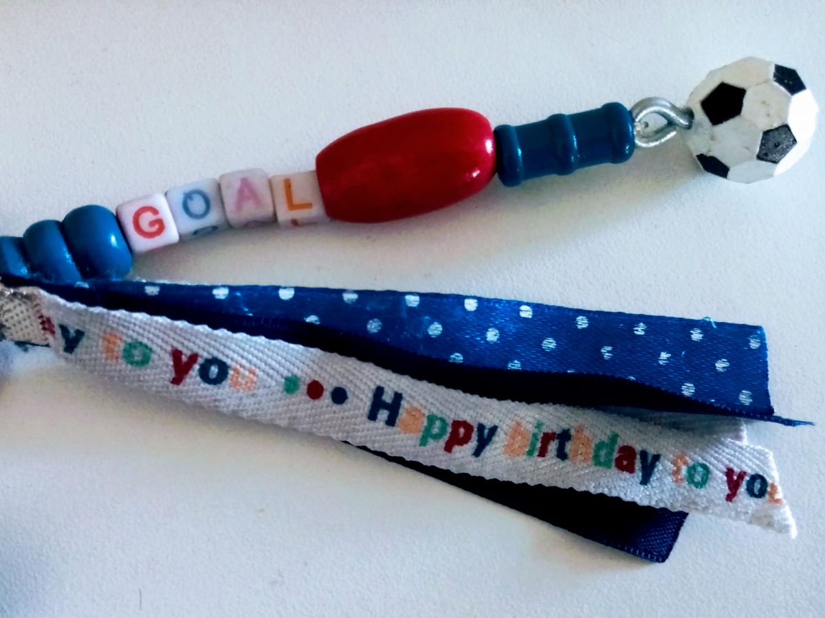 Il comporte une chaîne de perles et un ballon de football, avec le mot "GOAL" et des rubans dans les tons bleu, et blanc dont un ruban disant "Joyeux anniversaire". A offrir à un fan de foot pour y suspendre ses clés ou pour l'attacher à son sac de sport ou à son cartable.