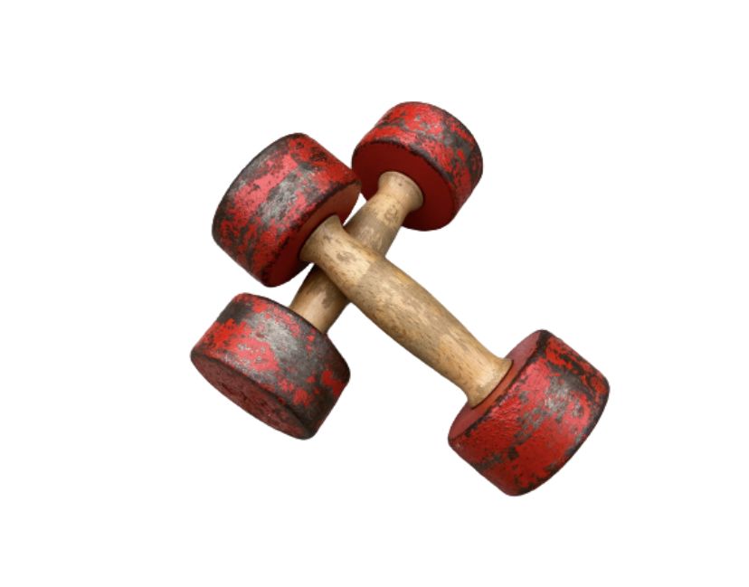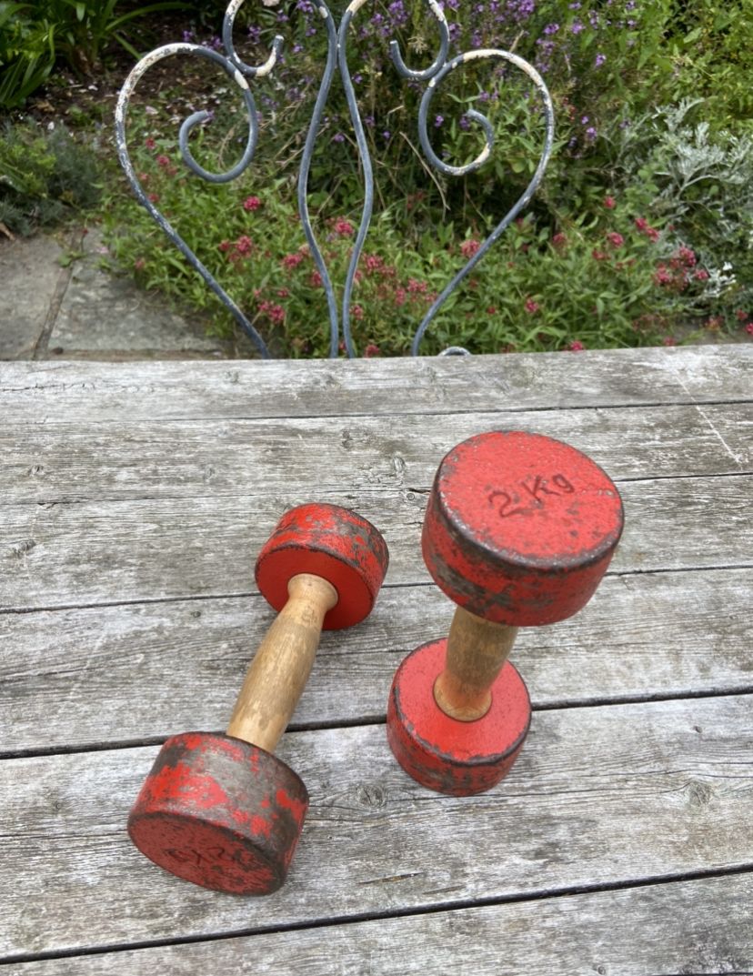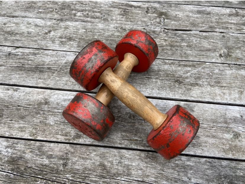 Paire d’haltères vintage 1970 2x 2 kg fonte & bois