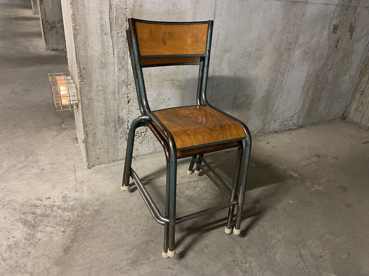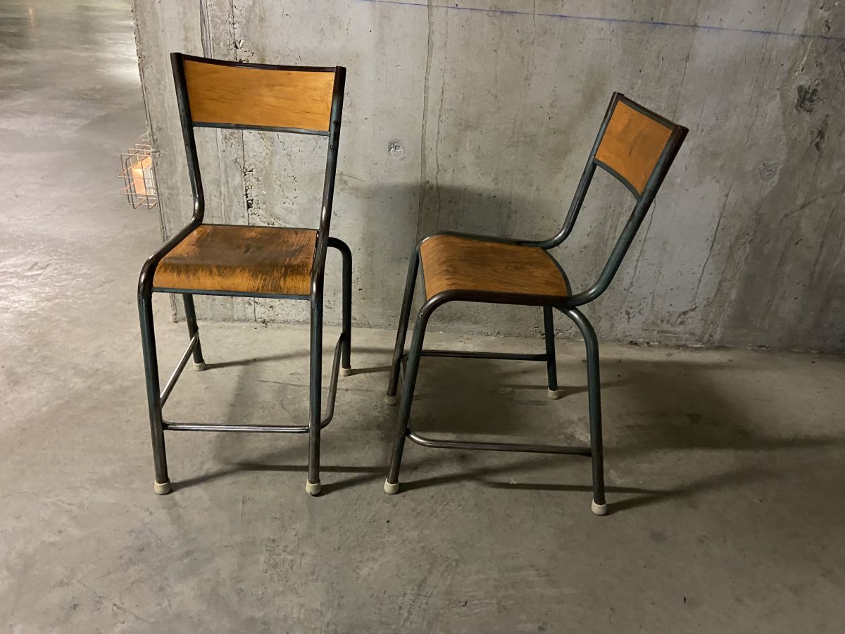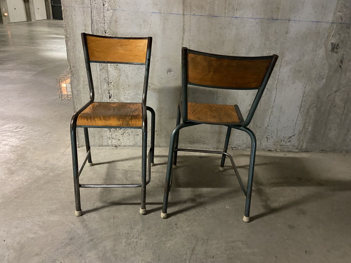 Paire de chaises hautes d’écolier Mullca 510 des années 60, superbe patine du bois et magnifique usure de la peinture gris bleutée d’origine, hauteur totale 86cm, hauteur assise 55cm, assise 35x35cm.