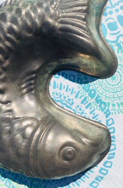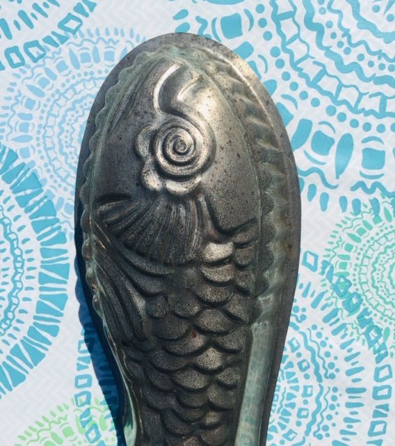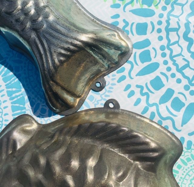 Lot de 2 moules en forme de poissons, en métal, d'occasion et ayant servi pour la cuisine. Vendus pour la décoration uniquement; ils sont globalement en bon état mais ils ont des petits points de rouille. Ils décoreront joliment une cuisine grâce à leur attache incluse (photo 5).