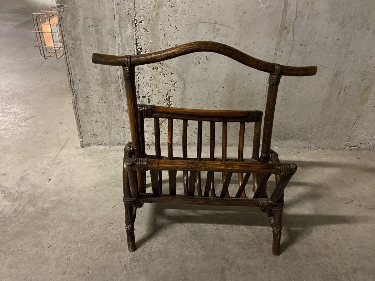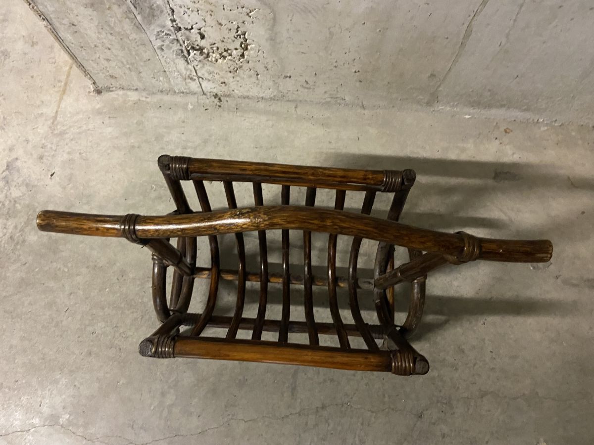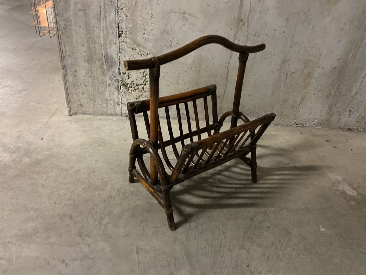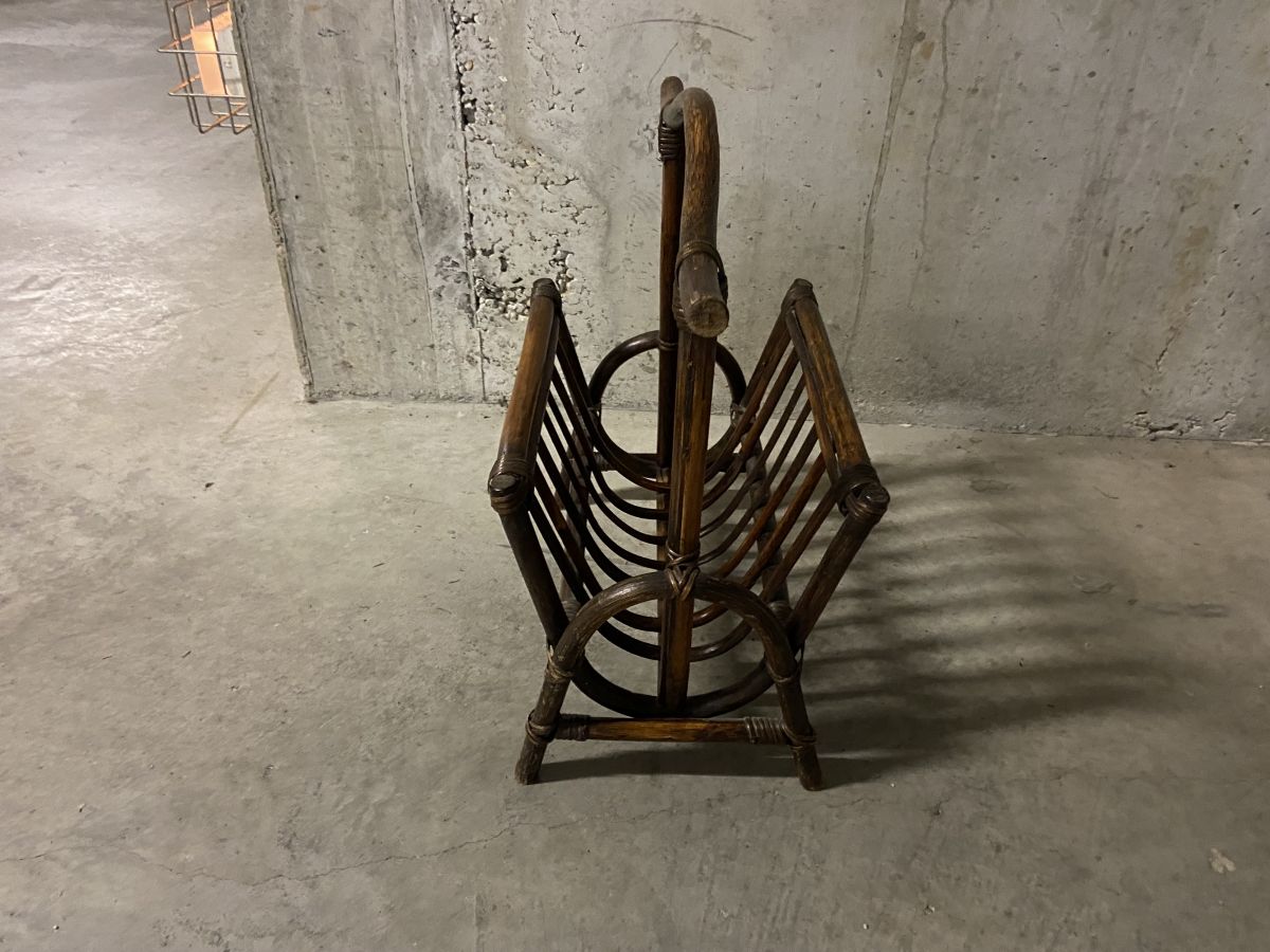 Porte-revues en rotin des années 70, belle patine, L.44xH.52xP.30, bon état.