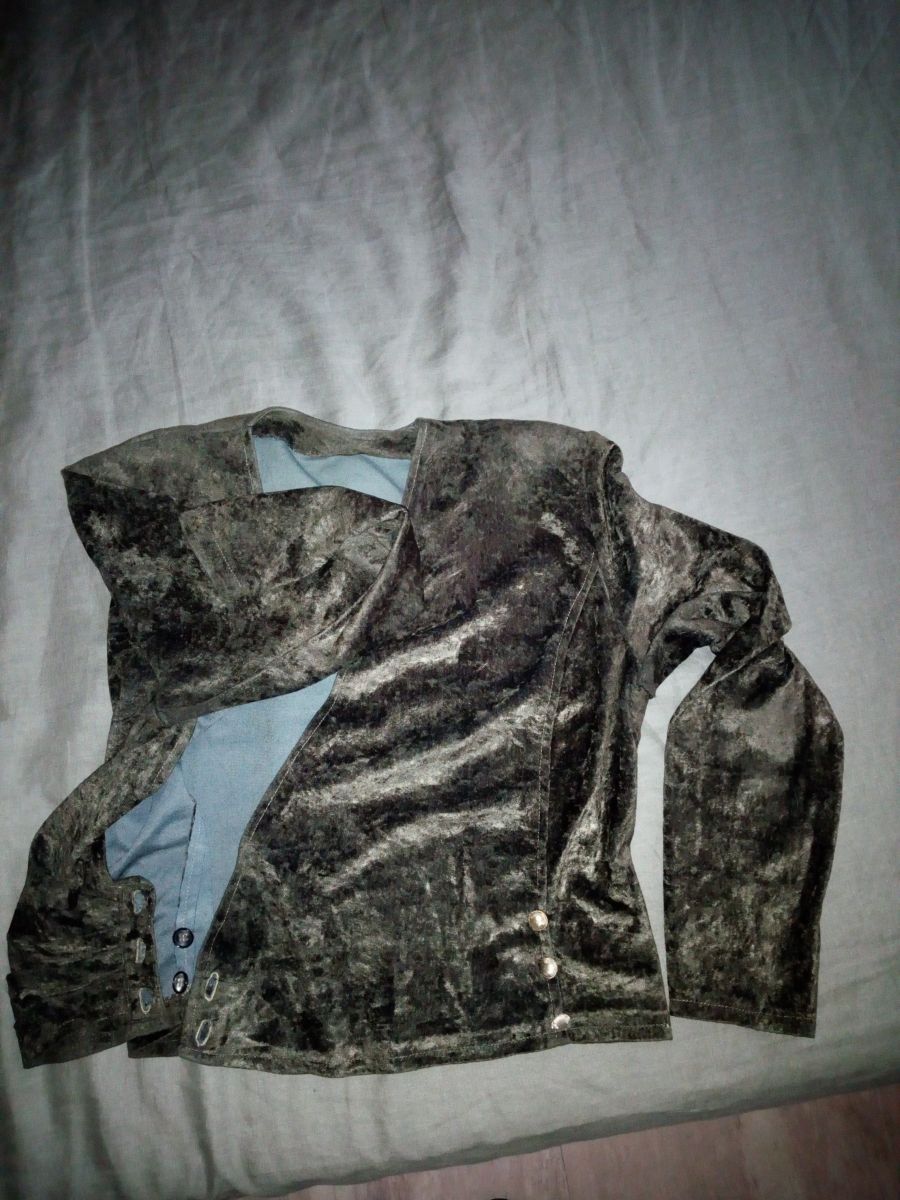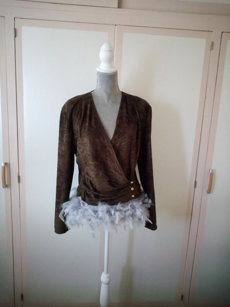 Haut cintré de forme cache coeur à encolure en V 4 plis froncés sur pattes boutonnage externe 3 boutons en métal doré (un peu passé pour les 2 du bas) et 2 boutons imitation corne intérieur manches longues avec petite épaulette correspond à un 42 normes des années 80 (création maison 1988) possibilité de déplacement des boutons (interne et externe) en bon état