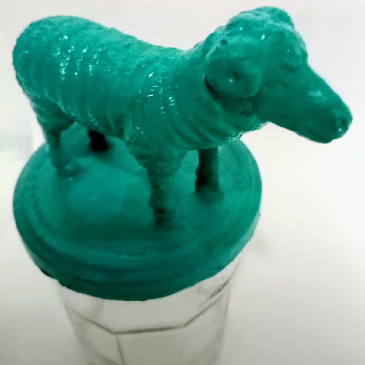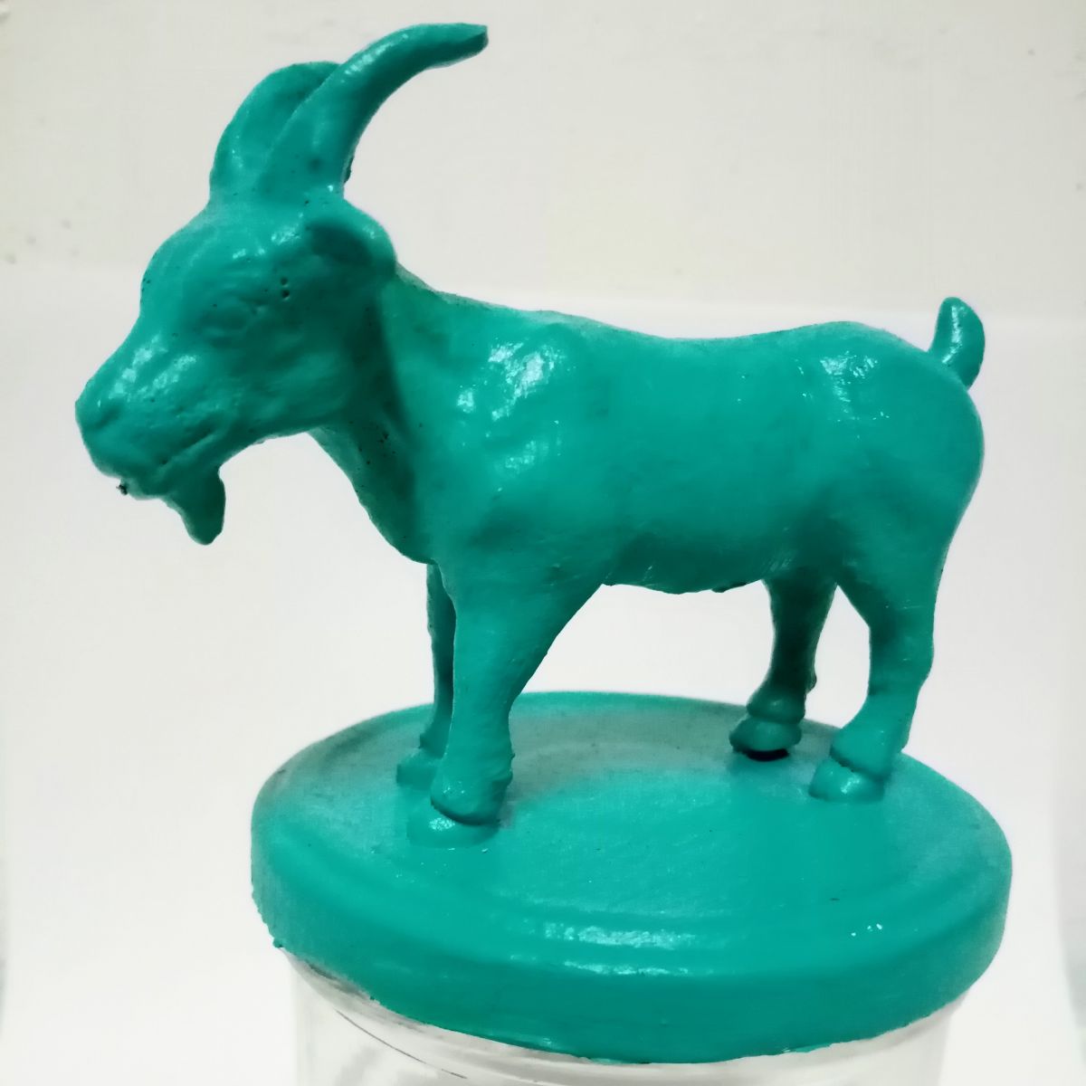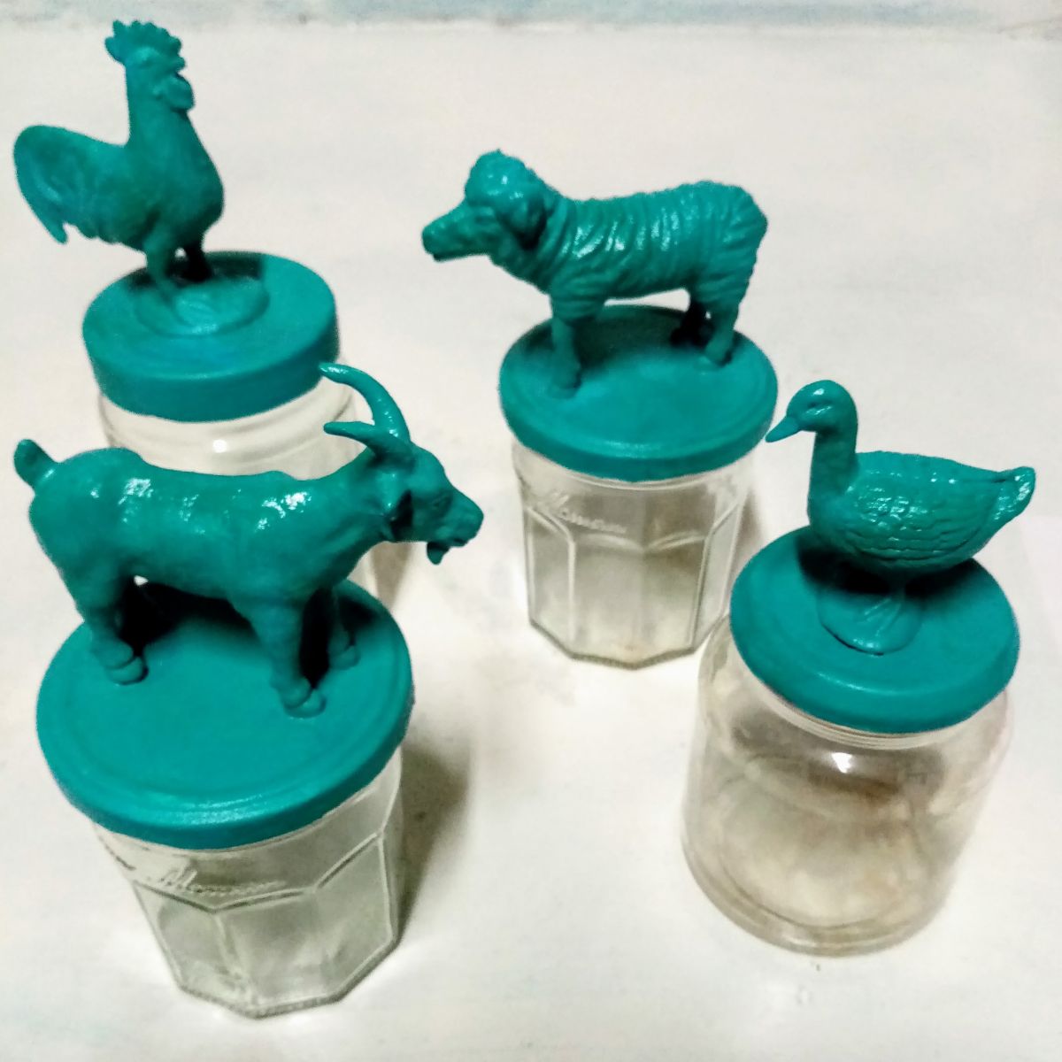 Sur les couvercles des bocaux, on a fixé des figurines de bélier, canard, chèvre et coq, puis on les a peint de plusieurs couches et vernis. Ils seraient jolis sur une étagère, dans la chambre d'un enfant aimant les animaux colorés