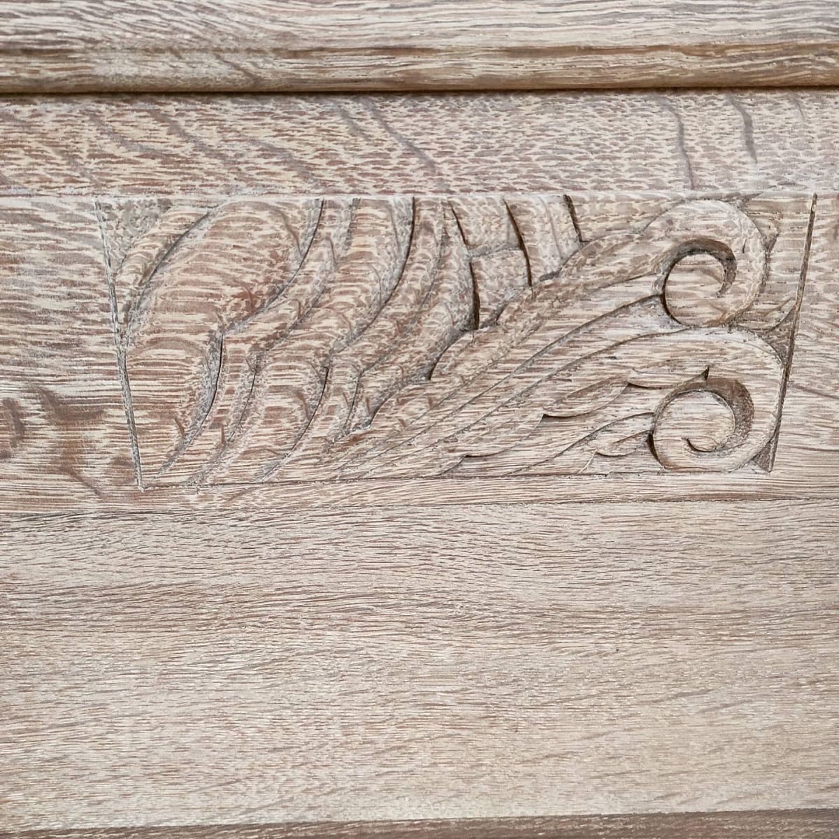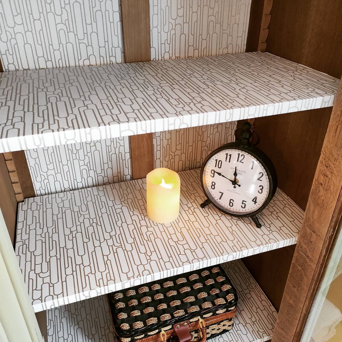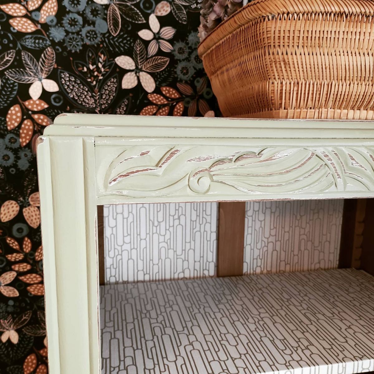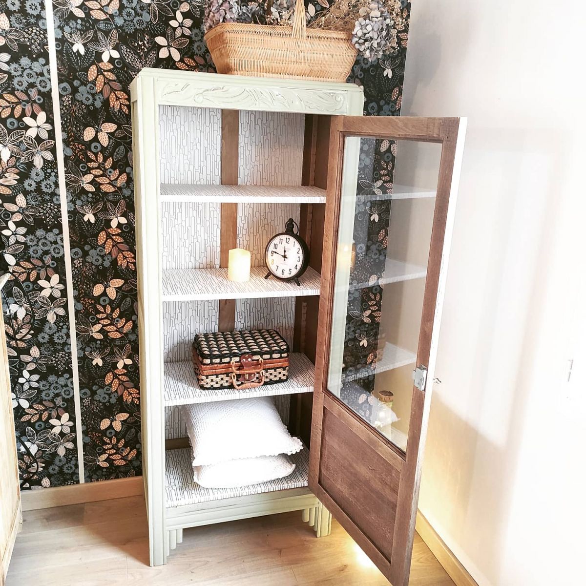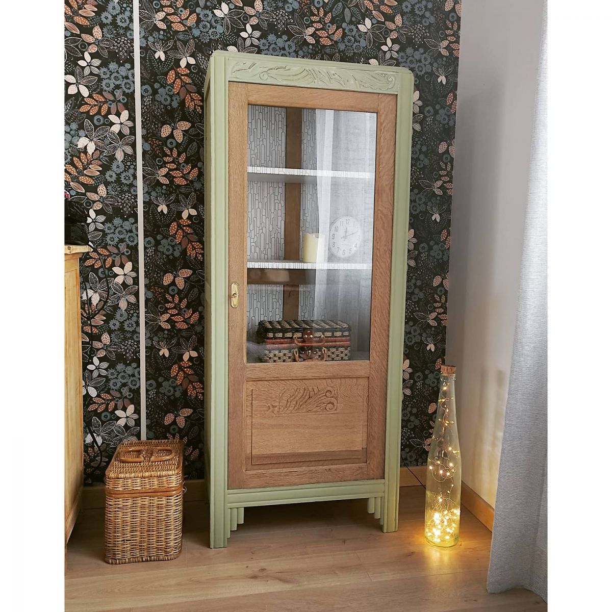 Ancienne vitrine art déco peinte en vert kaki, porte en bois naturel. 3 étagères et intérieur tapissés d'un joli papier