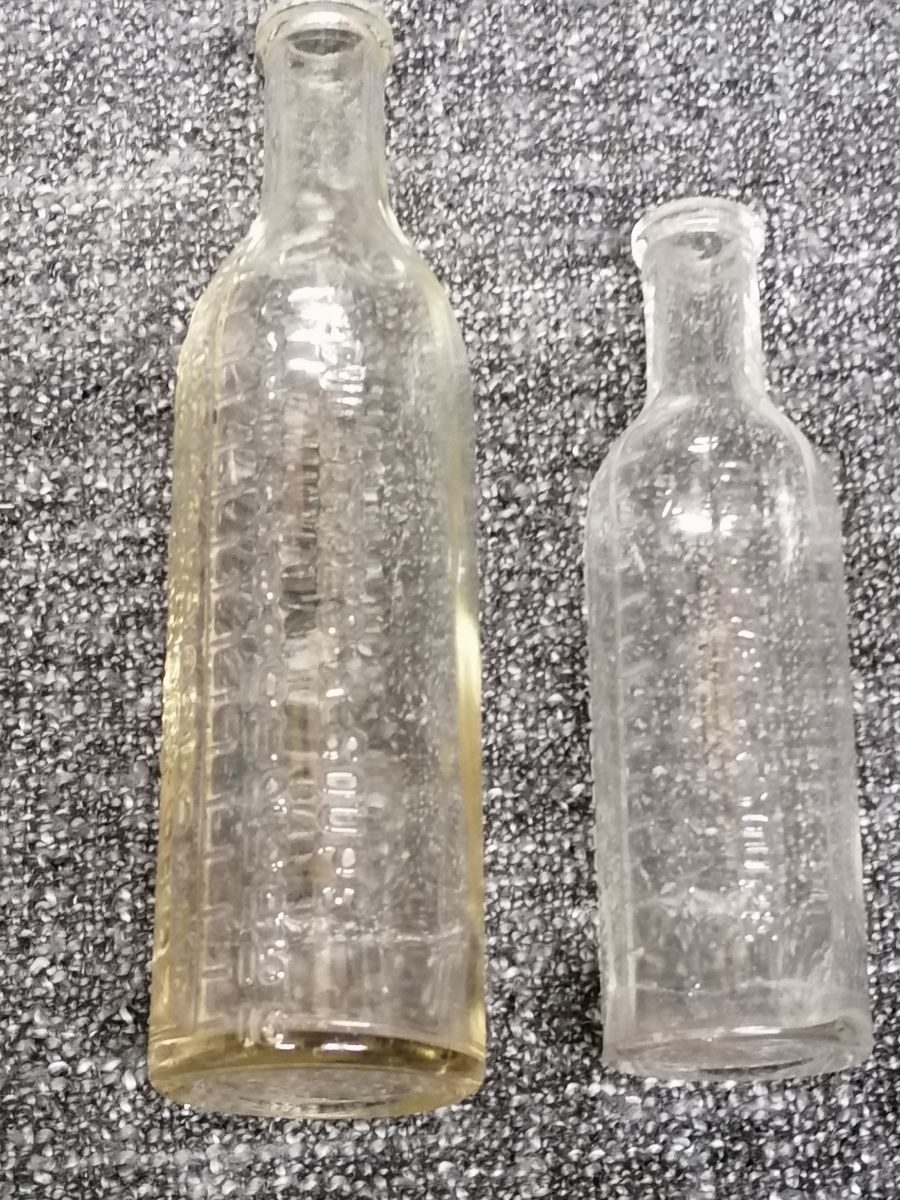 Deux flacons à pharmacie couleur ambrée 21 et 18 cm.