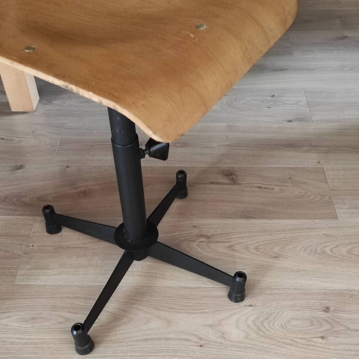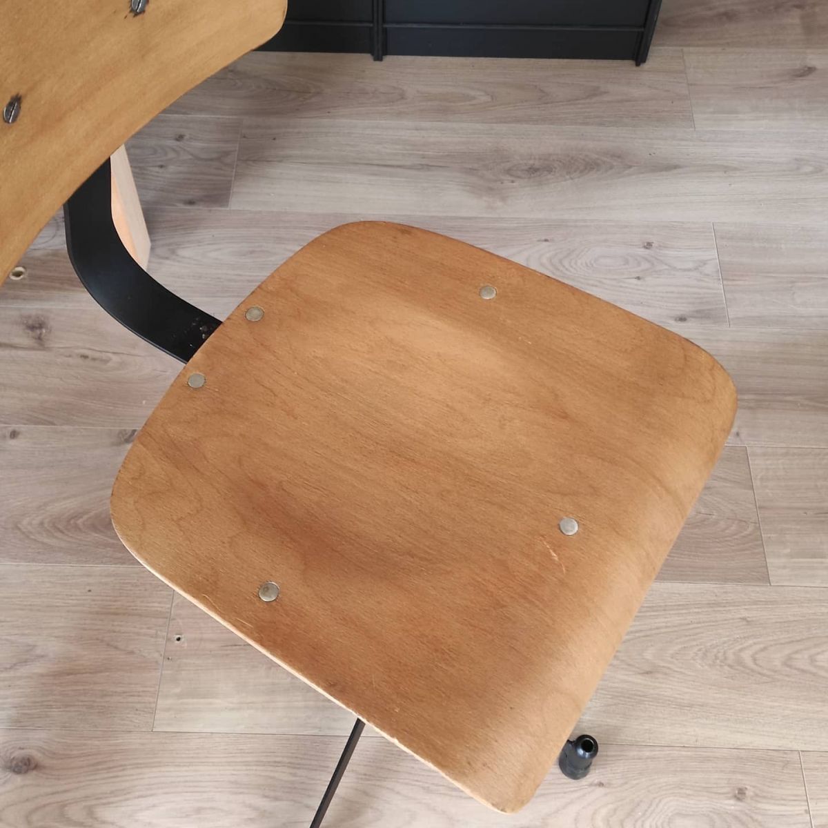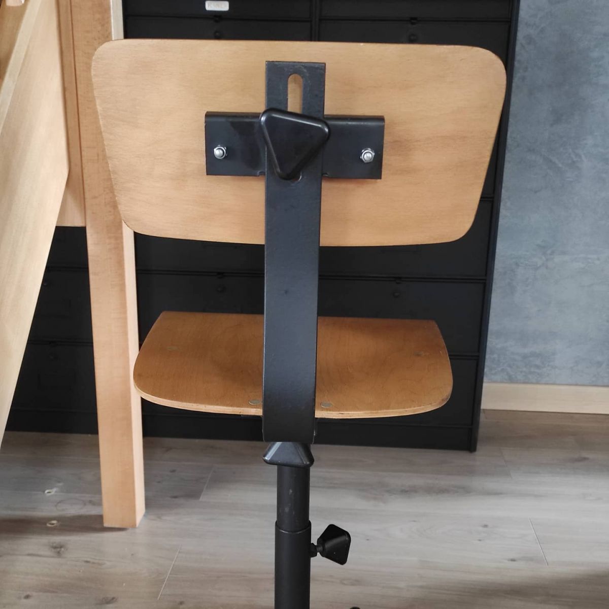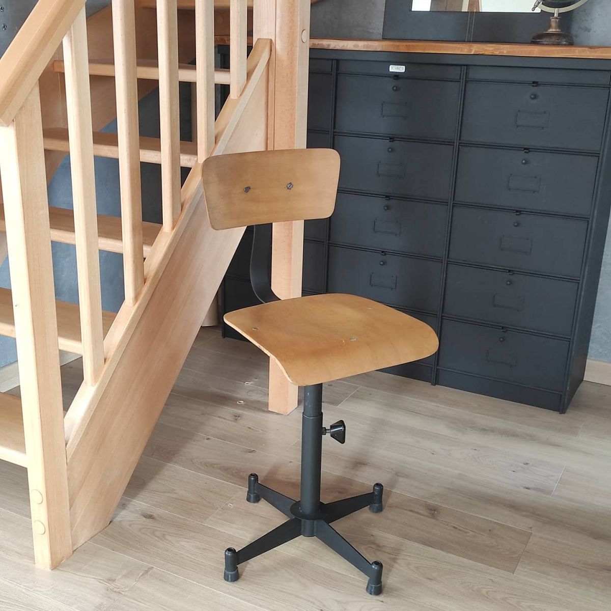 Chaise d'atelier va et vient peinte en noir mat, assise et dossier vernis naturel.