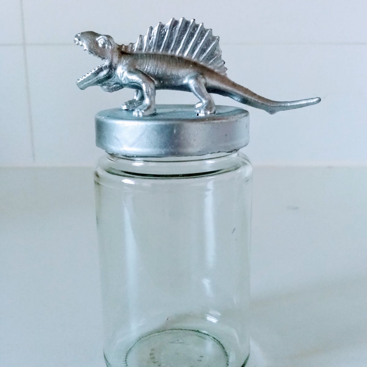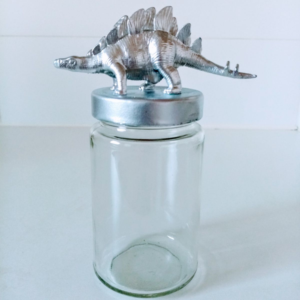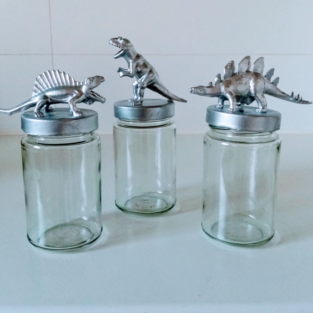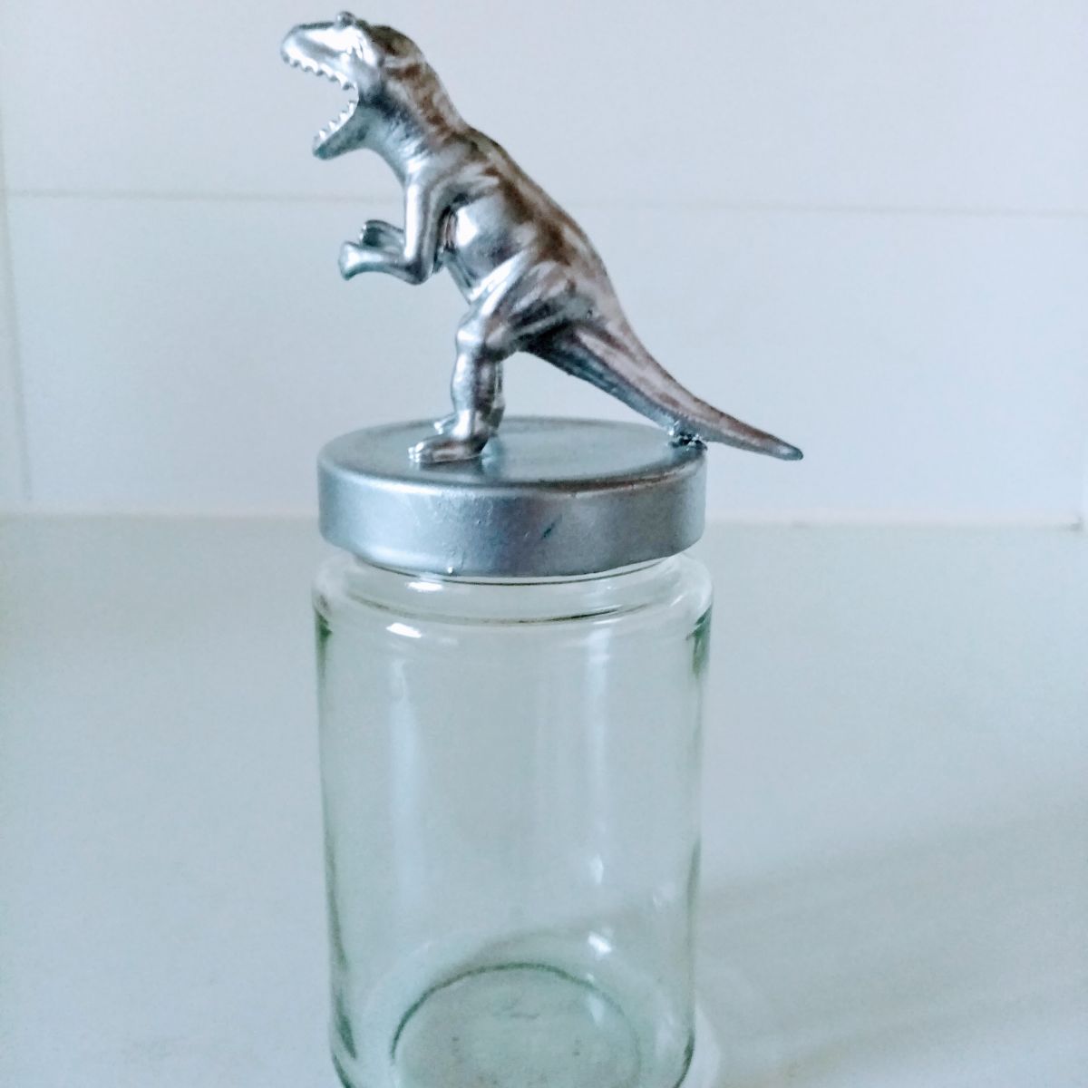 Sur les couvercles des bocaux, on a fixé des dinosaures puis on les a peint de plusieurs couches et vernis. Ils seraient jolis dans la chambre d'un petit fan des dinosaures!