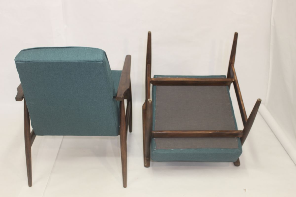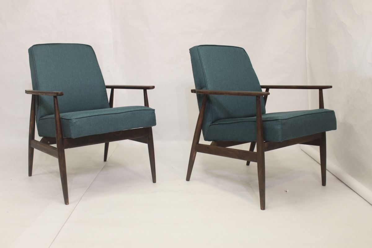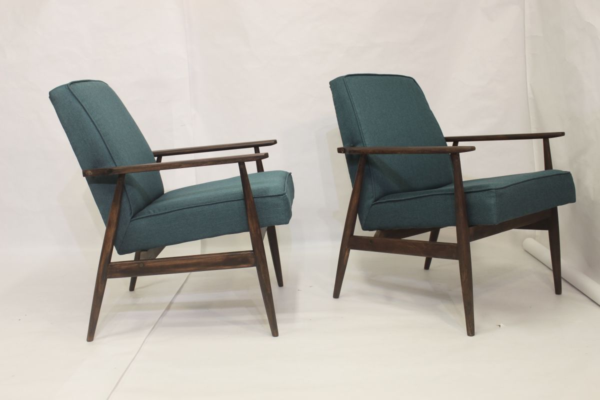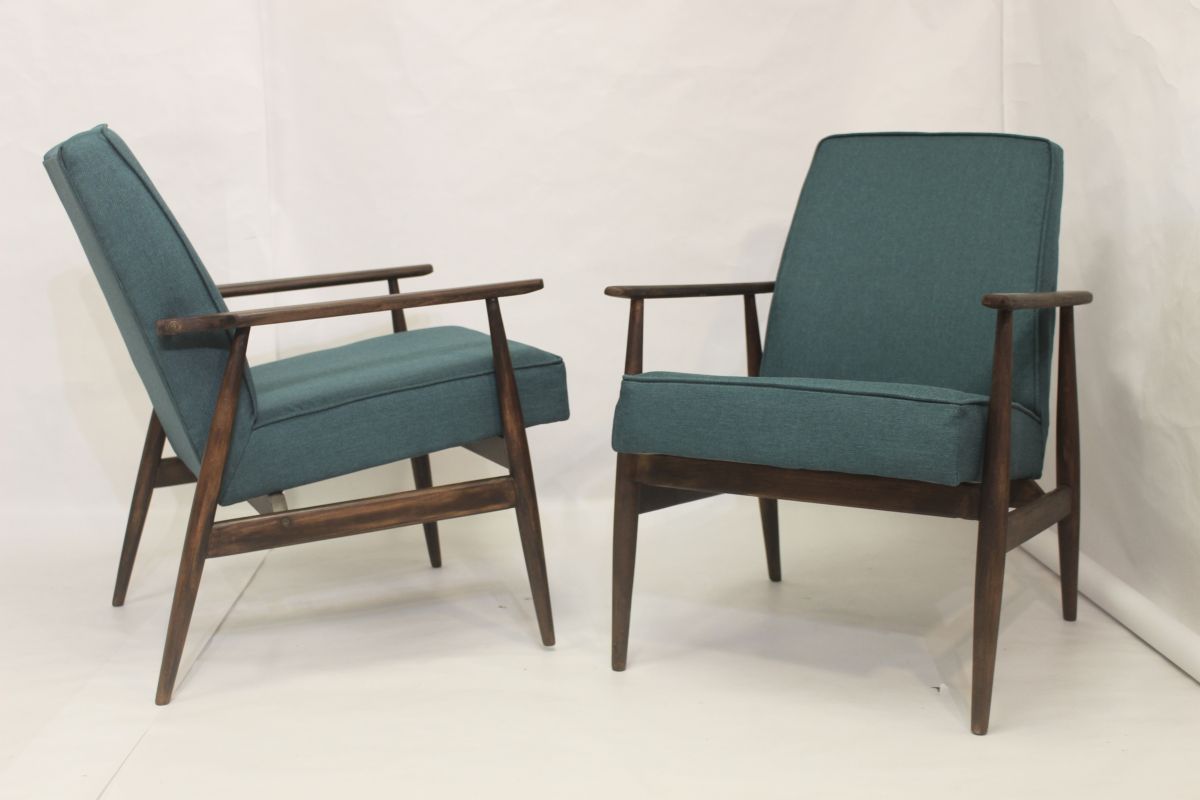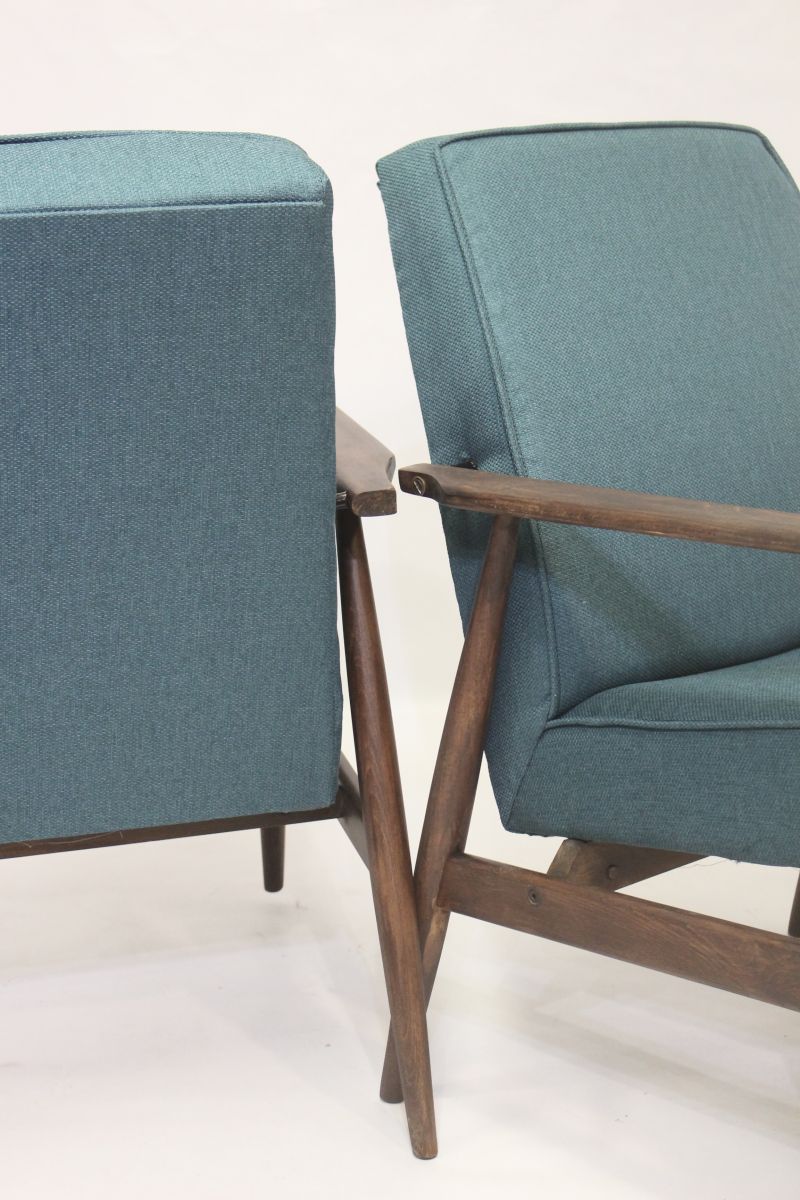 Paire de fauteuils 300-190 conçu par Henryk lis. Produit dans les années 70 dans les usines de meubles de bystrzyckie.sa taille compacte s'intègre parfaitement dans les petits espaces. La structure en bois a été restaurée. Et tout le revêtement intérieur a été remplacé le tout tapissé Dans un tissu bleu d’un beau vert (anti tache) pour garder le style des années 70. La restauration a été réalisée sans trahir l’état original de cette pièce iconique des années 70.