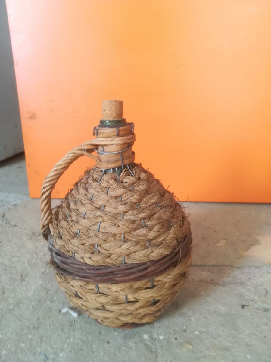 Dame jeanne authentique des années 60 en verre, osier et rotin tressé, bouchon liège de l'époque.