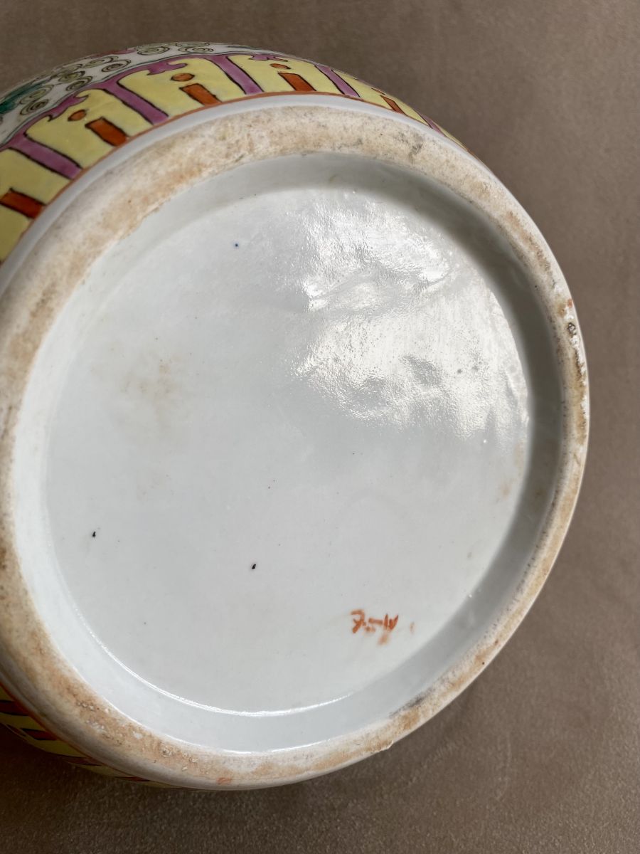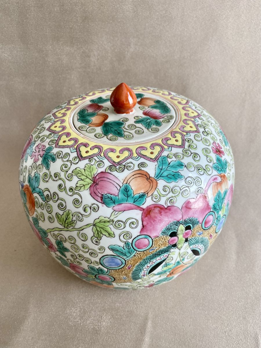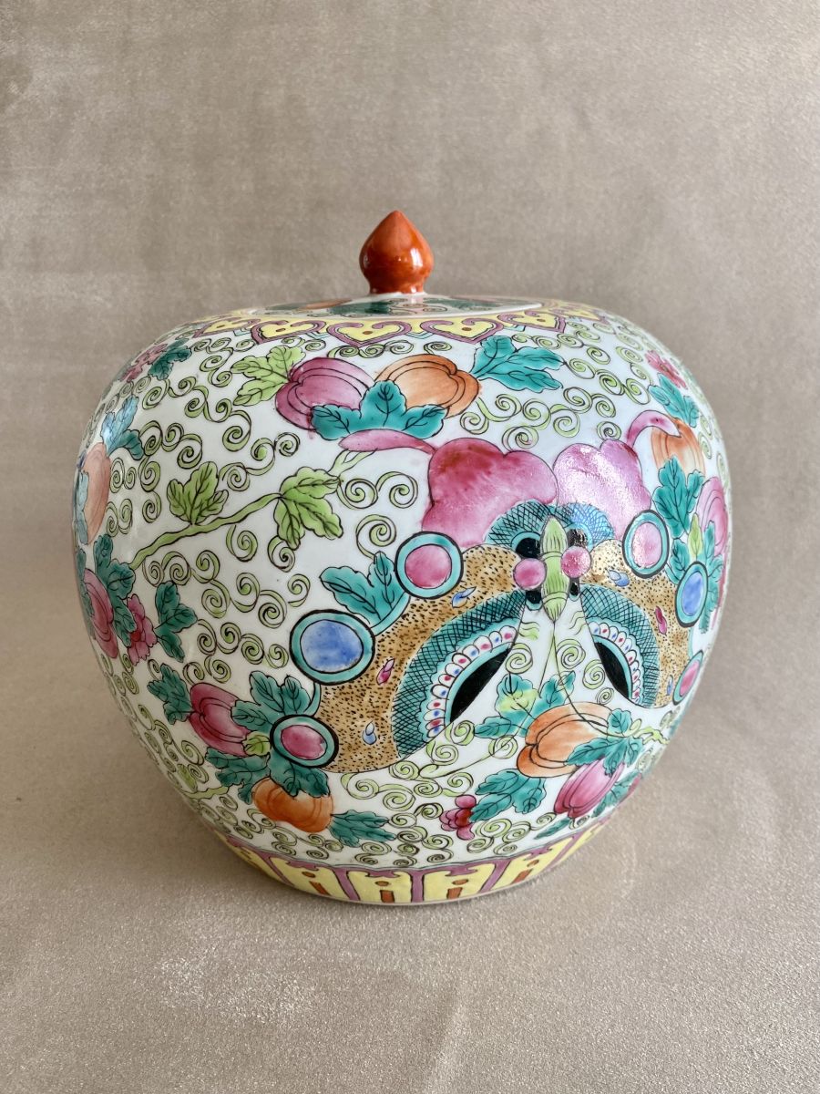 Grand pot couvert à décor multicolore de papillons et fruits.
