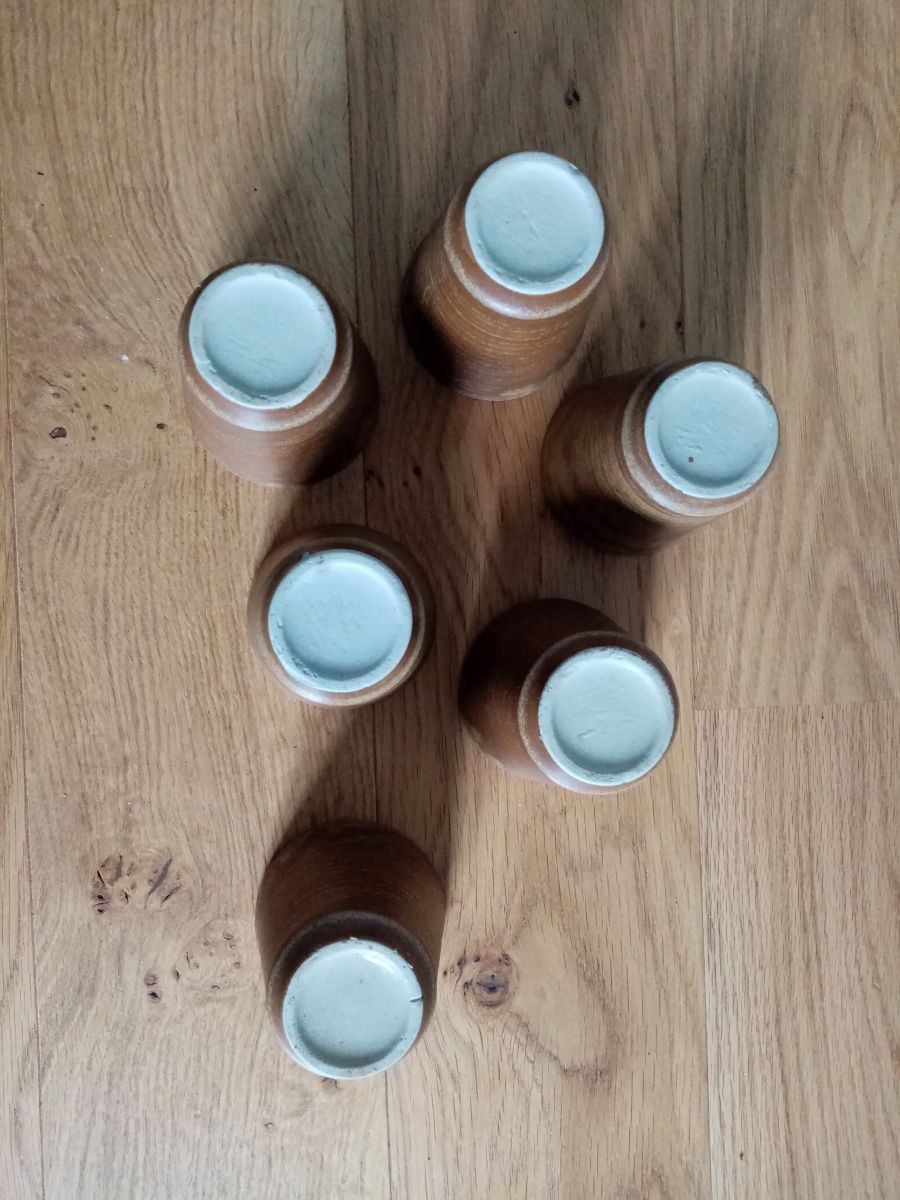 Ensemble de six tasses ou verres en grès émaillé. Elles sont très chaleureuses avec leur jolie forme arrondie ondulée et leurs couleurs chamarrées entre le brun, le beige, le caramel et le bronze. Elles sont en très bon état, seule une tasse présente un petit éclat sur le bord de sa base. Elles mesurent 7, 7 cm de diamètre au plus large, et 9 cm de hauteur. Le tout pèse 1220 g.