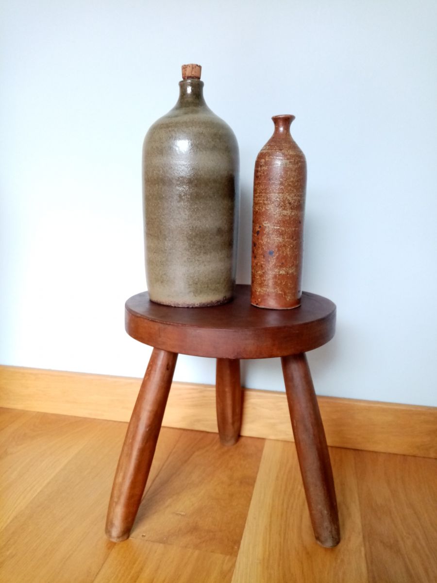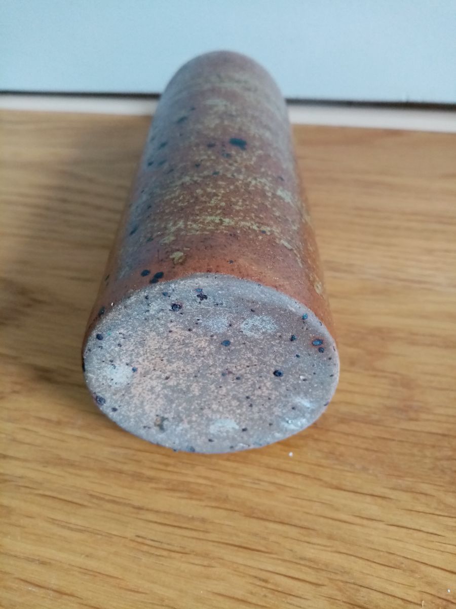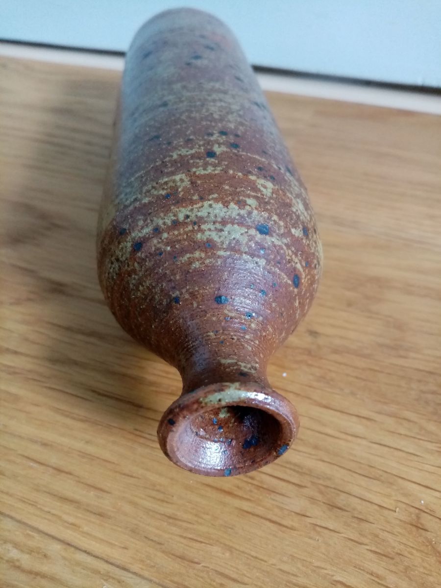 Jolie petite bouteille en céramique (grès pyrité), avec une forme élancée, haute, dans les tons bruns. Elle est en bon état, ni fêle, ni éclat. Elle mesure 21 cm de hauteur pour un diamètre de 6 cm. Elle pèse 490 g.