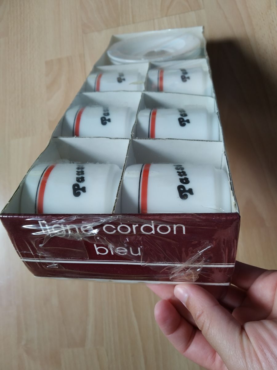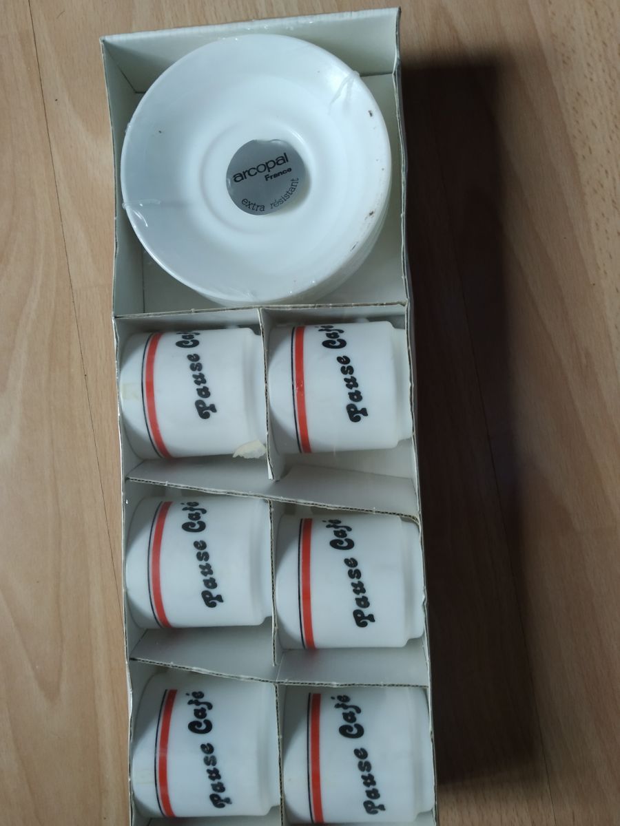 6 tasses et petites sous tasses neuves encore dans l'emballage d'origine. Appartenant à ma grand mère .