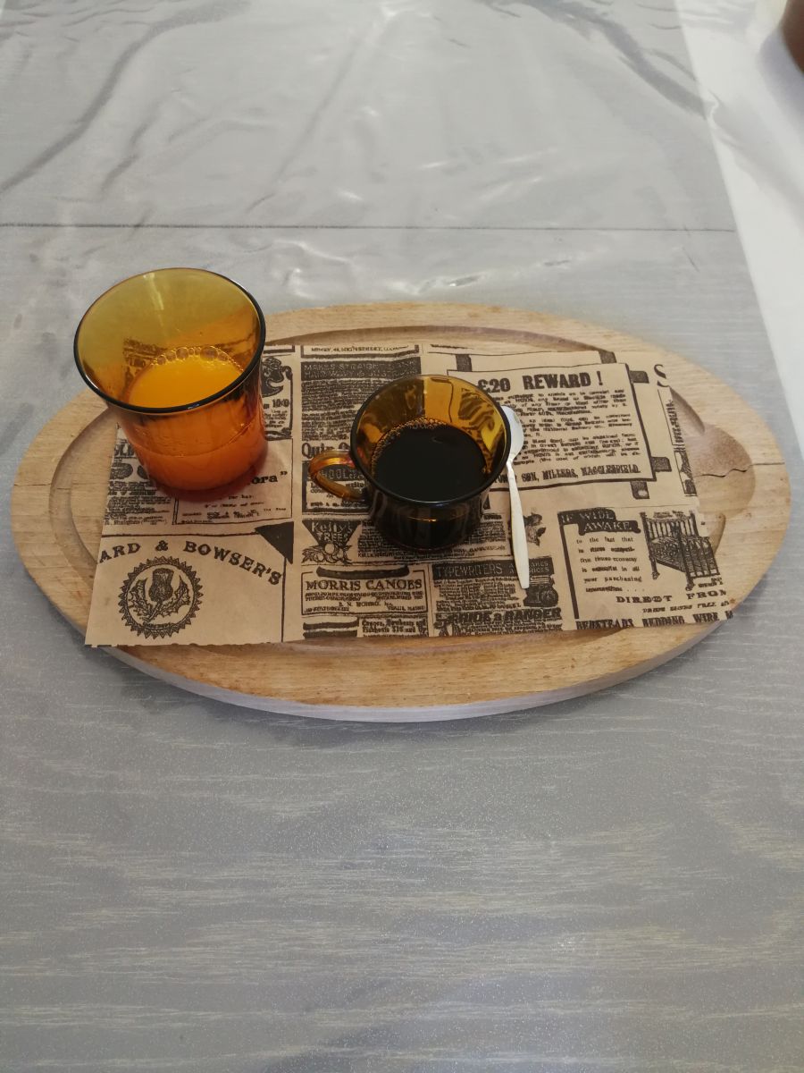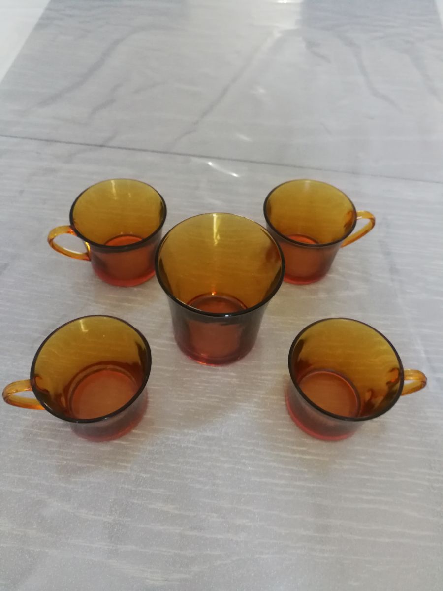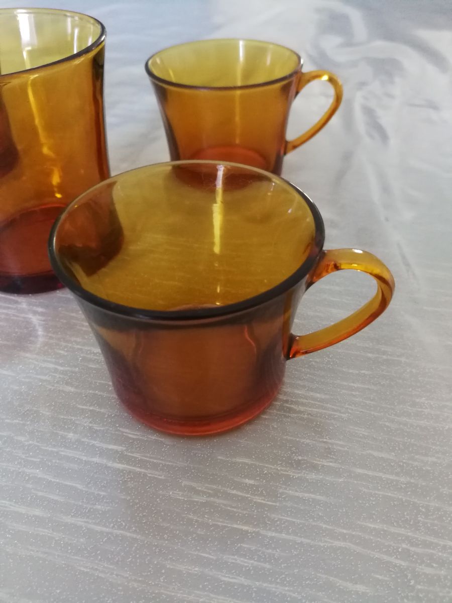 4 tasses, 1 verre Duralex ambré pour prendre le café.