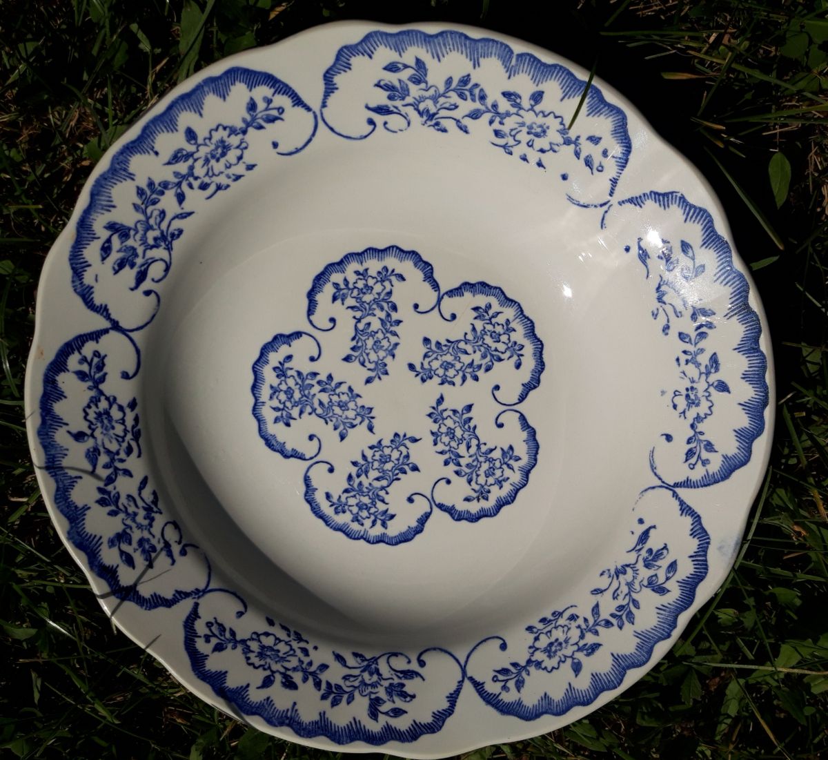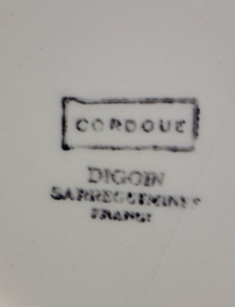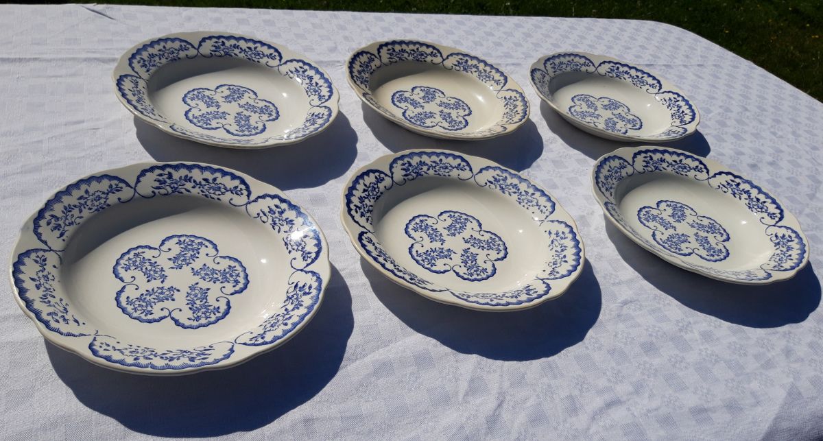 6 belles assiettes creuses de Sarreguemines et Digoin modèle Cordoue. 24 cm de diamètre. Bon état. Une des 6 a une petites traces du temps comme sur la photo. Sinon aucune ébrechure.