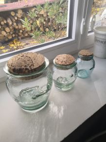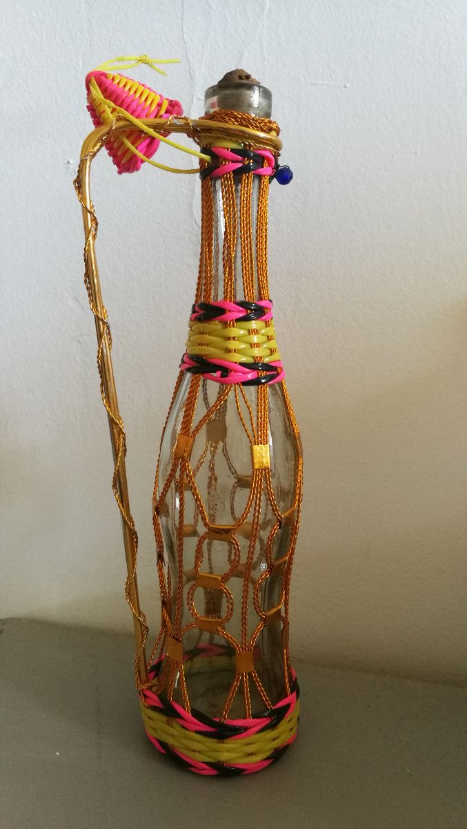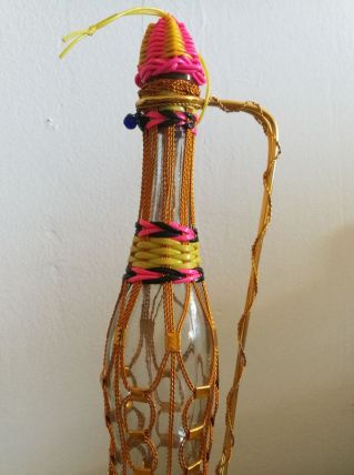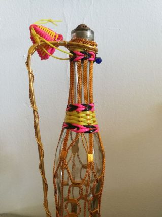 Jolie carafe ou bouteille scoubidou, si typique des années 70. Elle est très décorative avec ses couleurs rose, jaune et noir. L'anse est recouverte de fil metalique torsadé ainsi que la bouteille ce qui n'est pas toujours le cas mais qui est beaucoup plus joli. Elle possède encore son capuchon. Elle est en verre transparent et possède un socle en bois. Elle est en bon état, très propre. Elle mesure 28 cm de haut sans le capuchon, 33 avec et 22 cm de diamètre au plus fort du renflement. Elle pèse environ 500g.