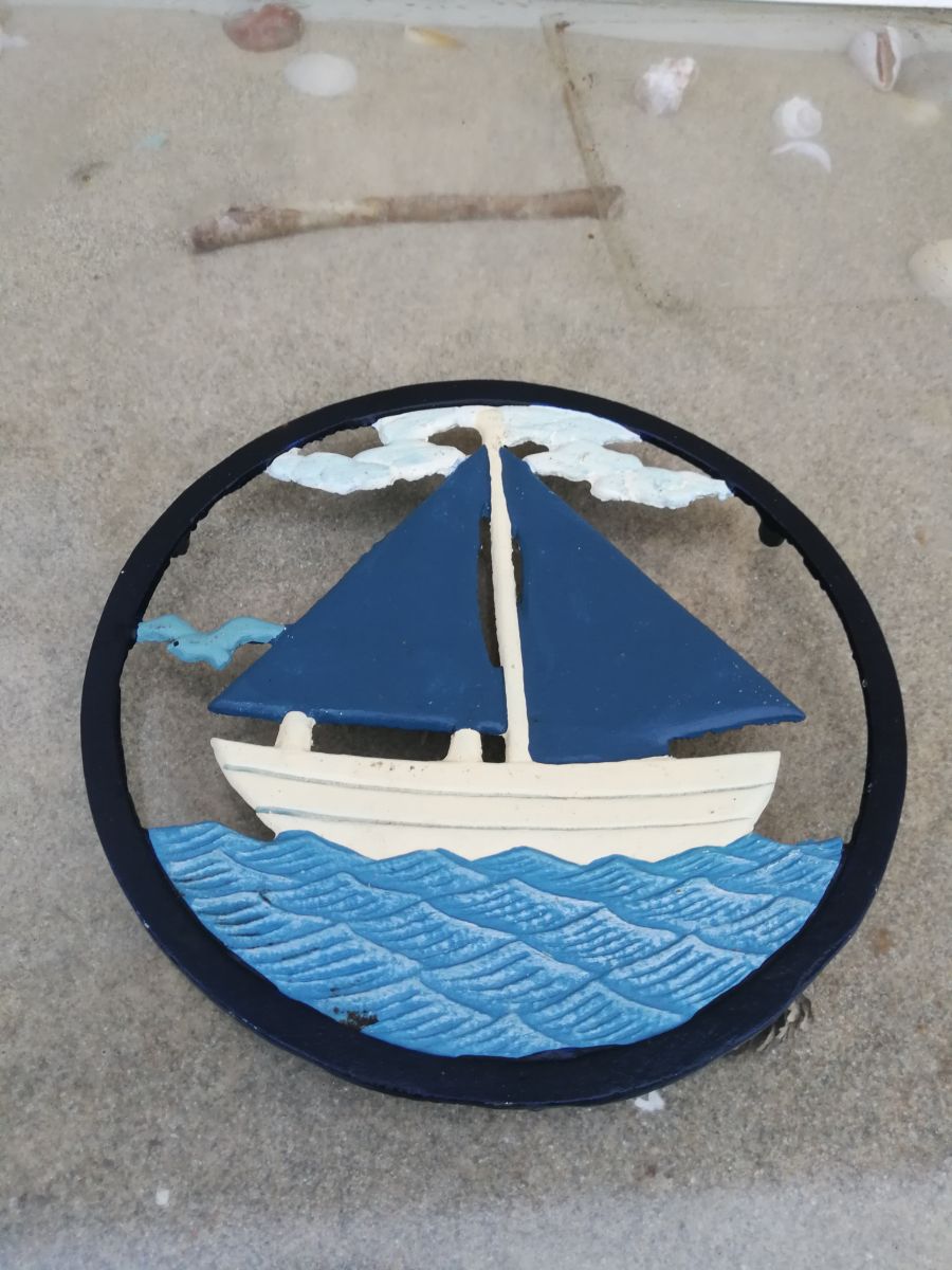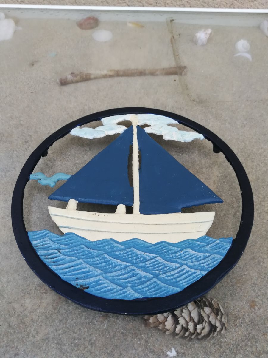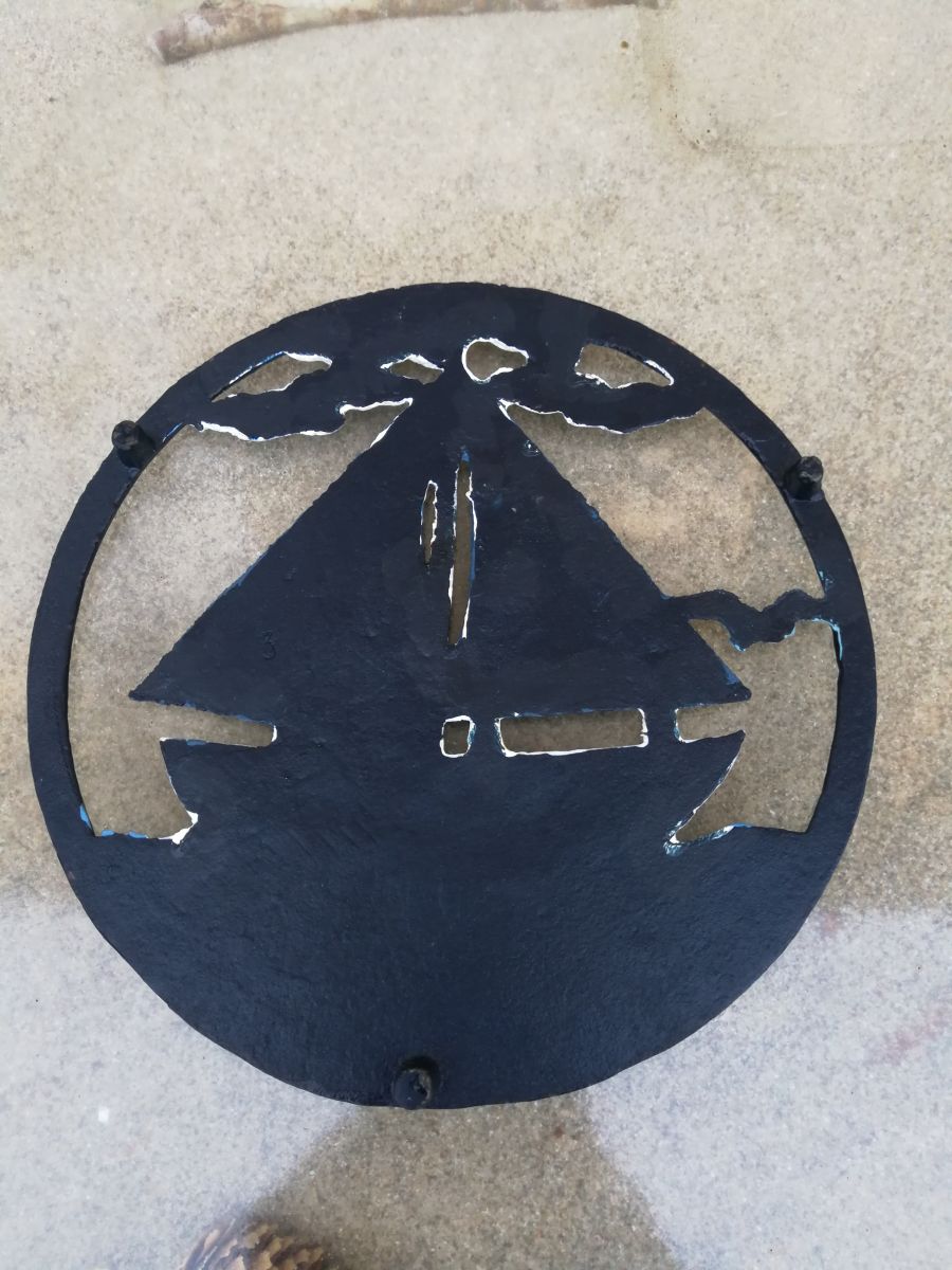 Charmant dessous de plat en fonte représentant un voilier à la mer.