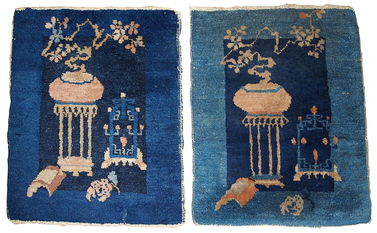 Hand made antique collectible pair of Peking Chinese rugs in navy blue and sky blue shades. The rugs are in original good condition.