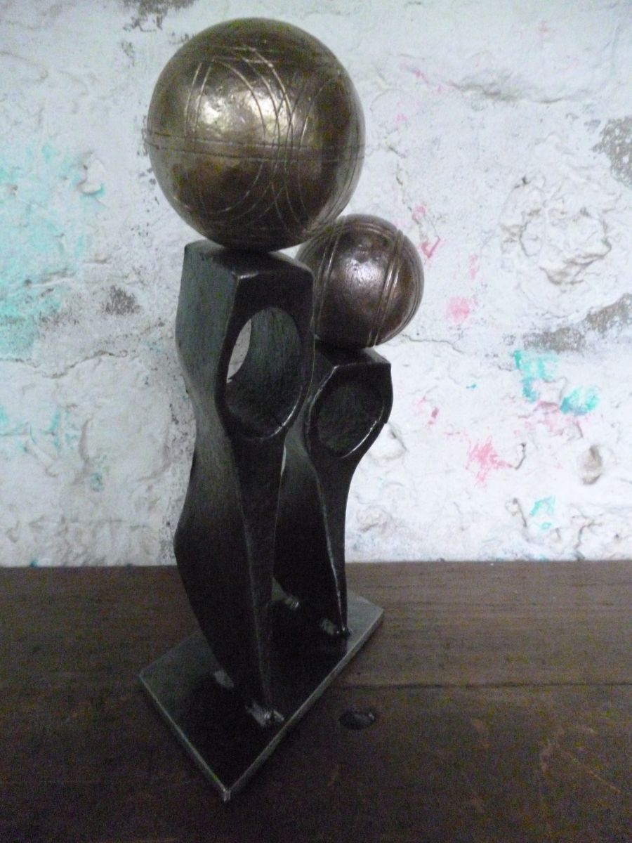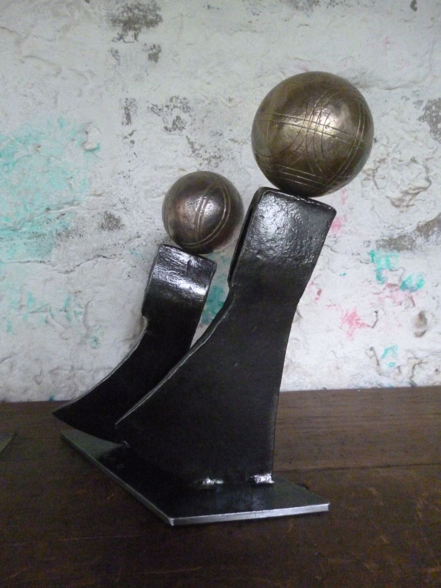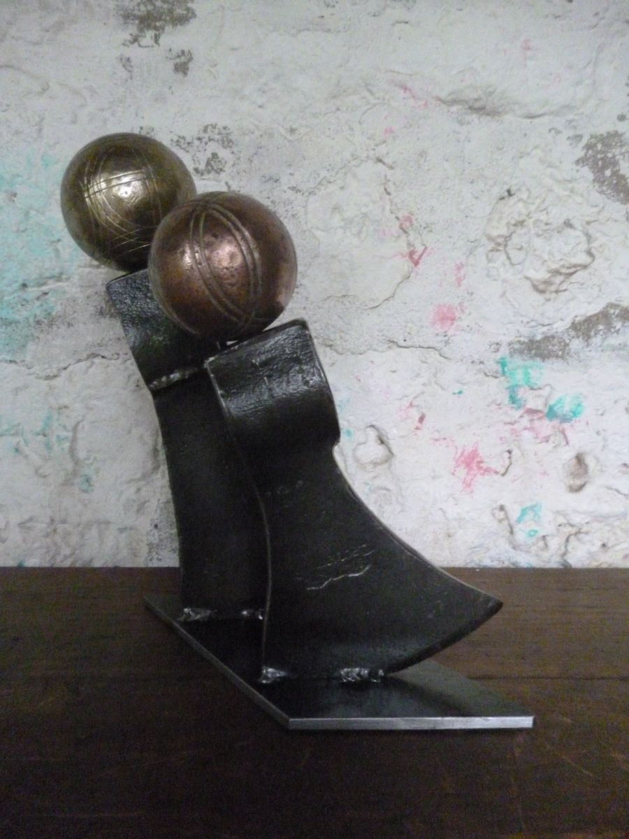 Sculpture metal realisee a partir de divers objets de recuperation . ( hache de bucheron , hachette , boule lyonnaise laiton , boule petanque cuivre ) .
