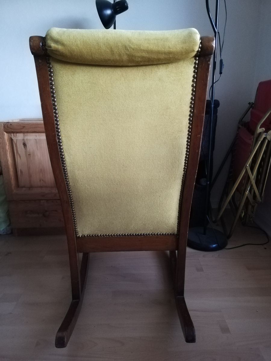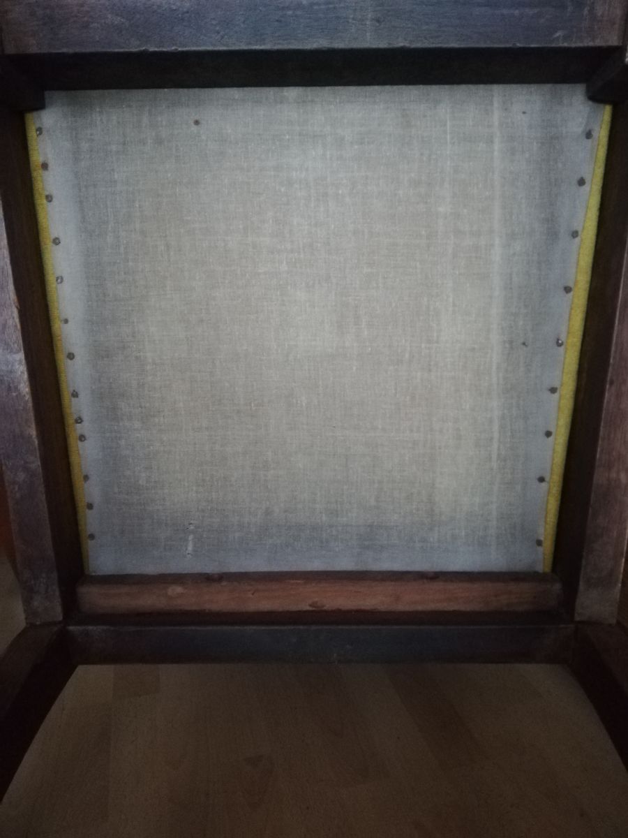 Tissu taché et plusieurs petites traces de choc sur le bois.