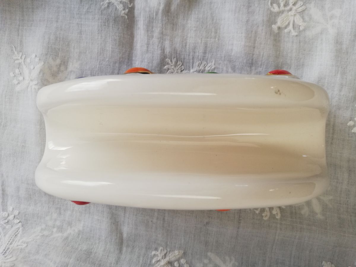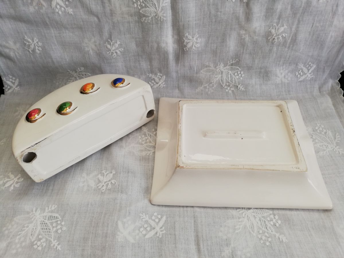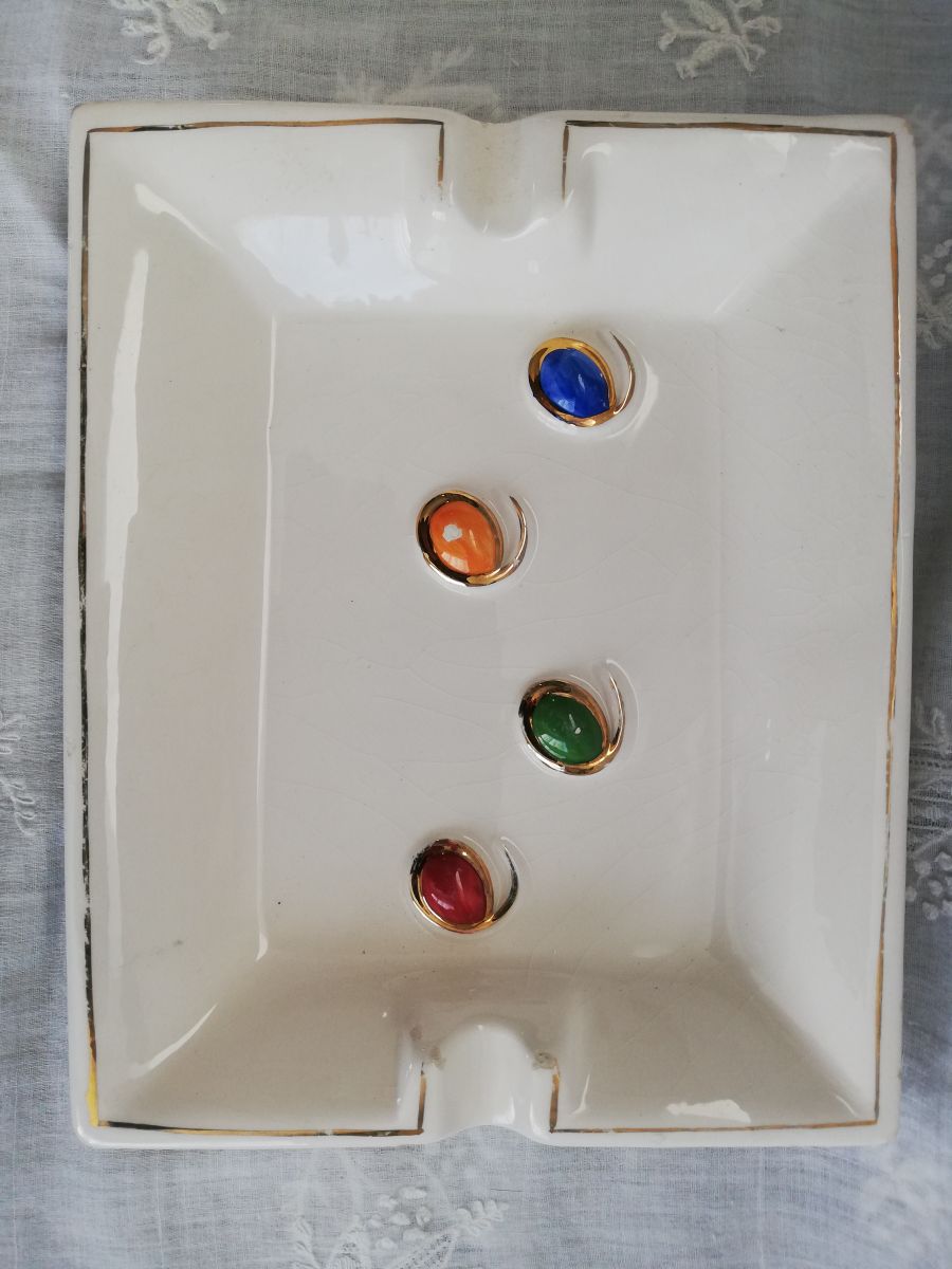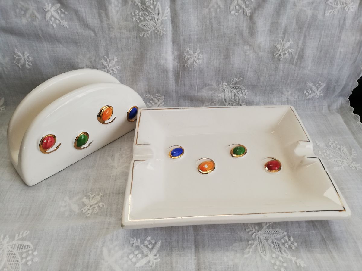Ensemble vintage "très années 50", d'un cendrier, vide poches vintage en céramique et de son porte lettres, fond blanc cassé, joli décor de forme de 4 "pierres teintées" cernées de doré.