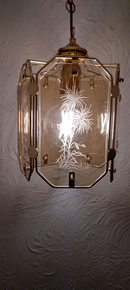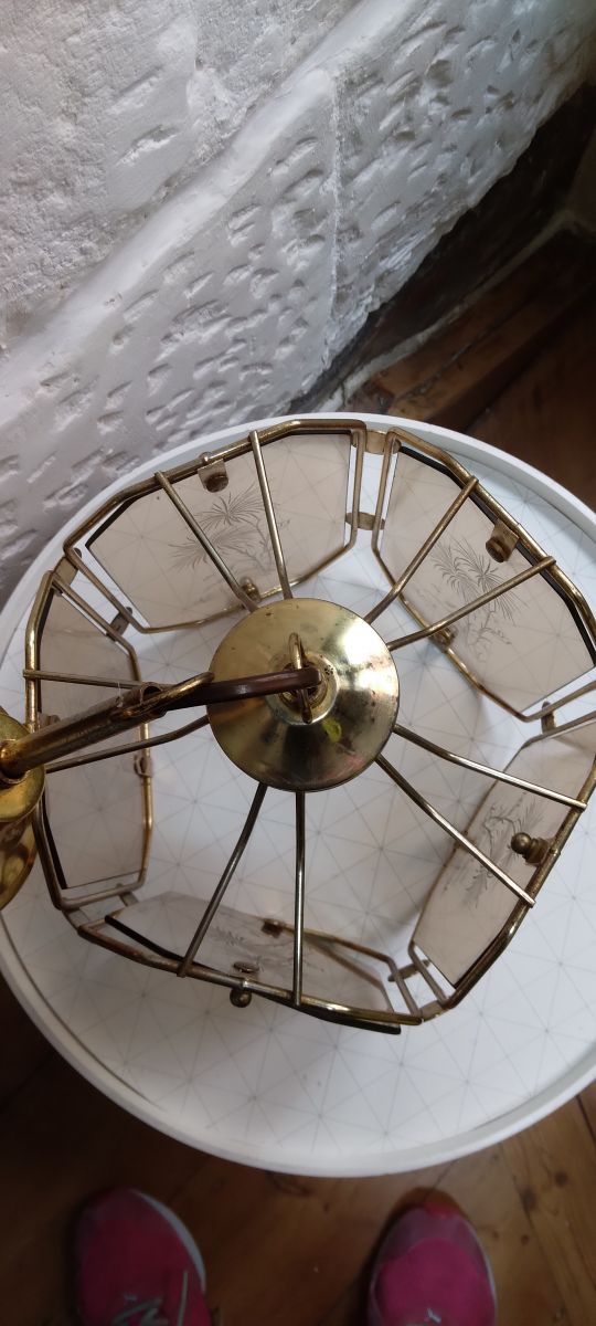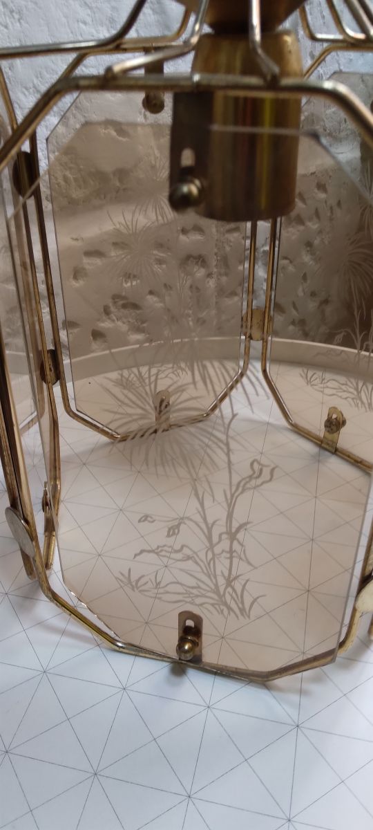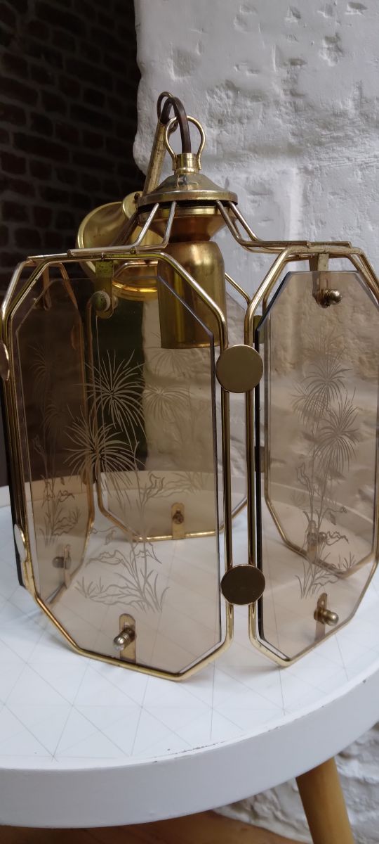 Suspension verre fumé et laiton année 70 très tendance à noté quelques trace dusage non visible a l oeil nu .
