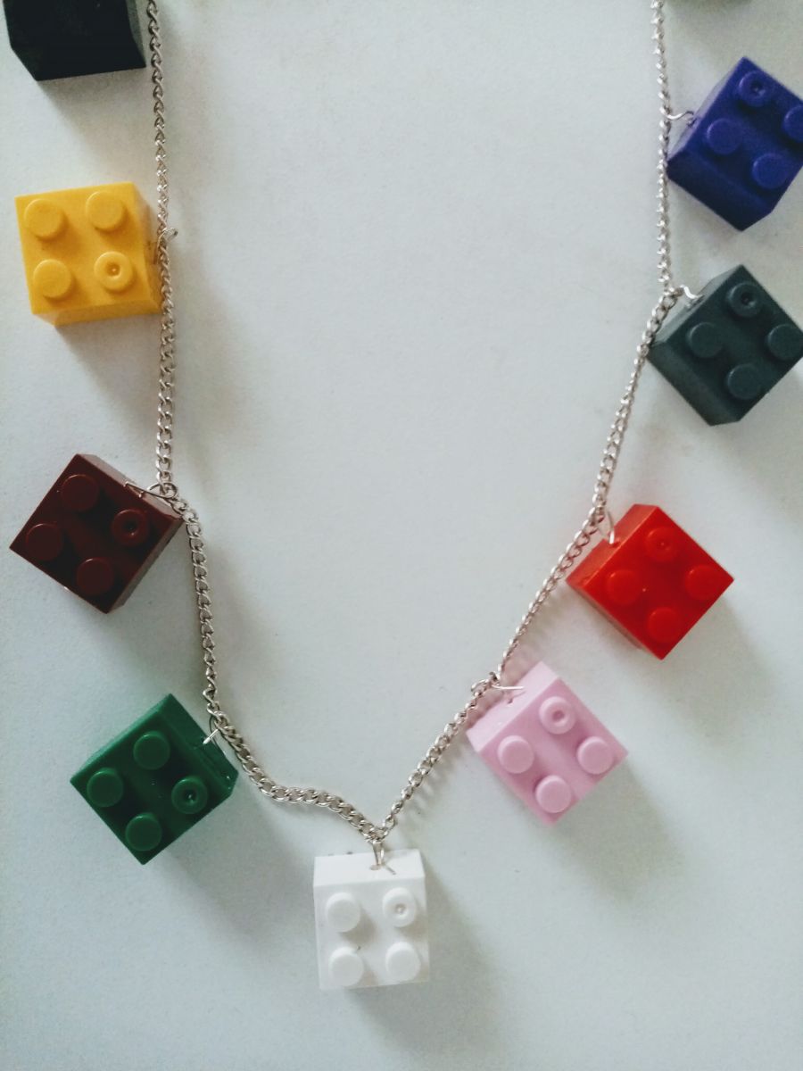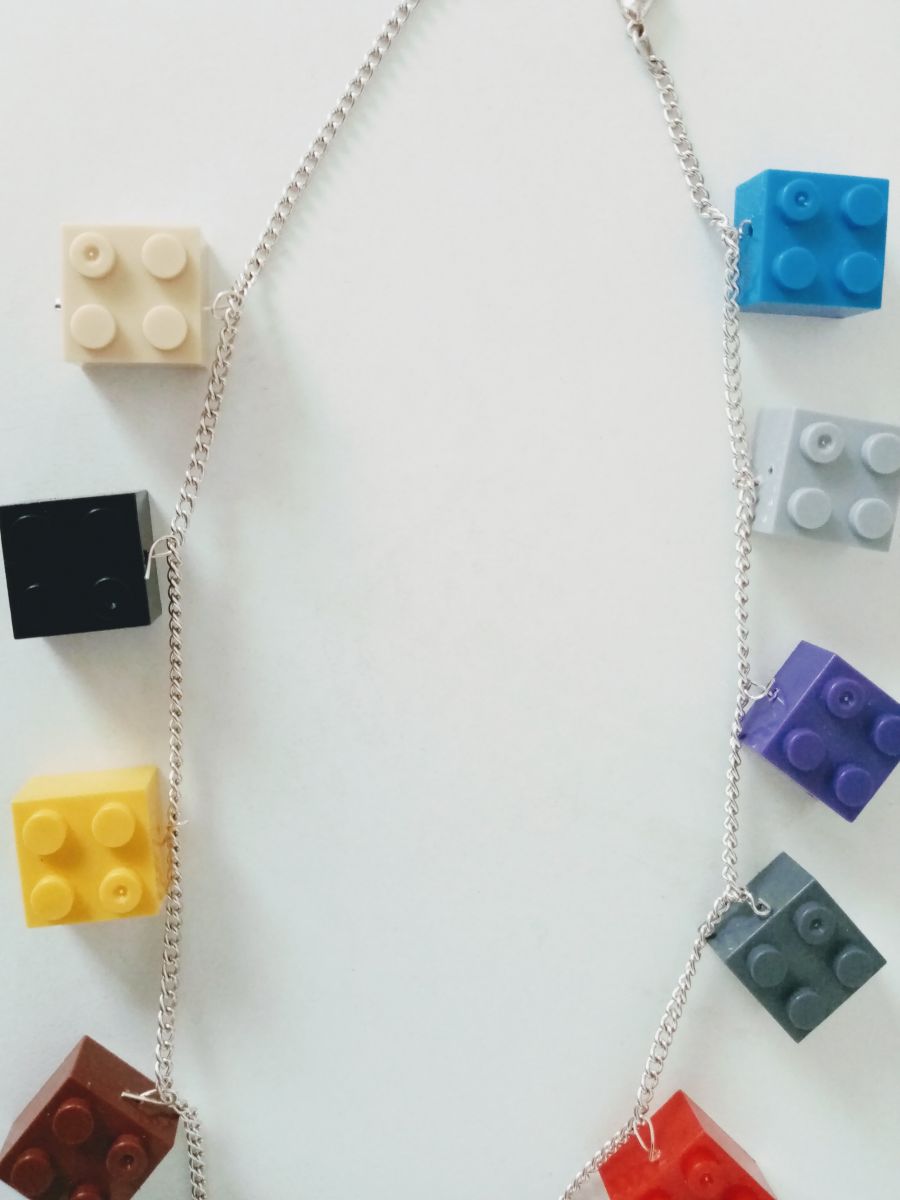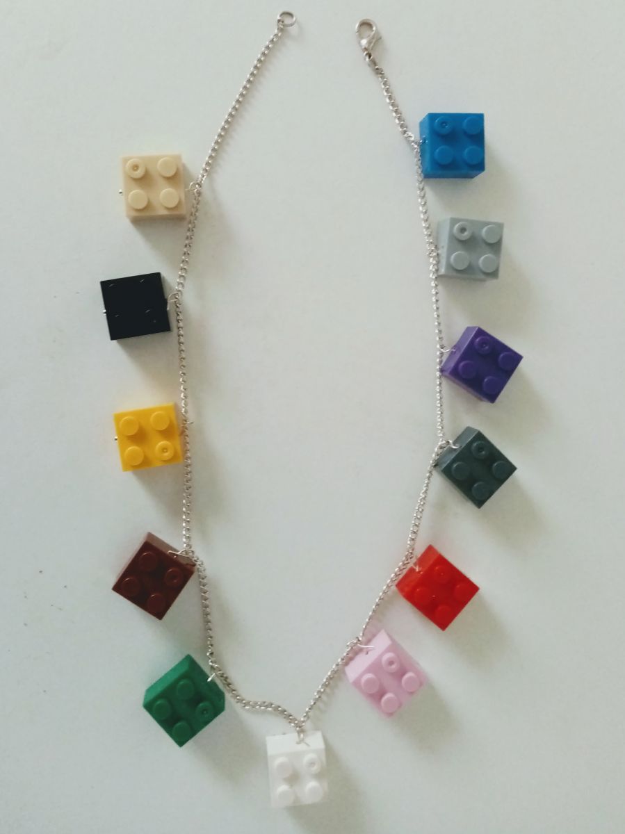 ICI: Un collier de briques carrées Lego multicolores, attachées à une chaine argentée sans nickel, non allergénique, à fermoir mousqueton.