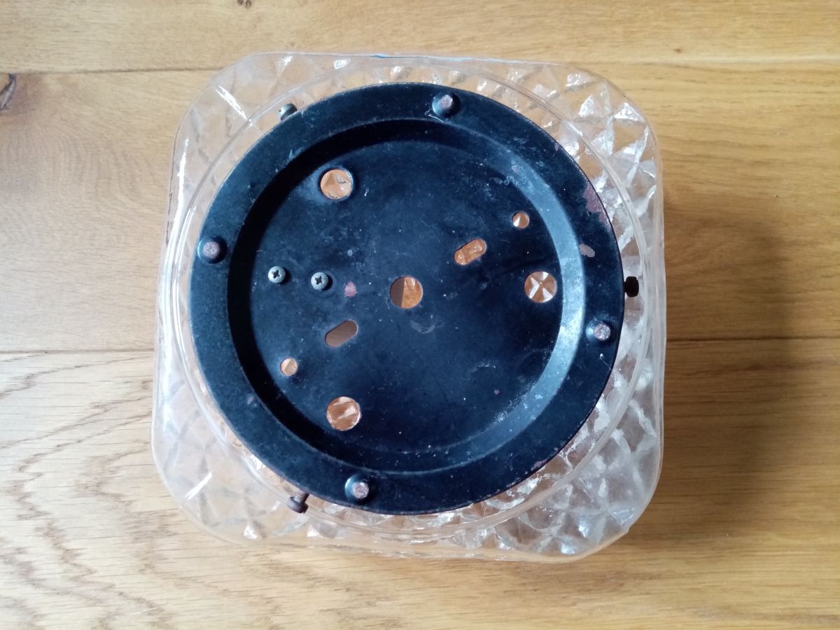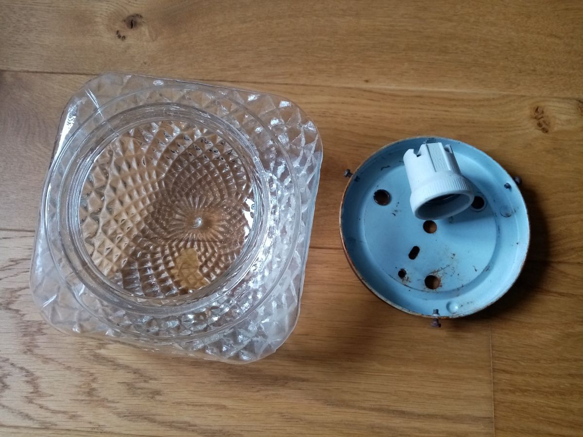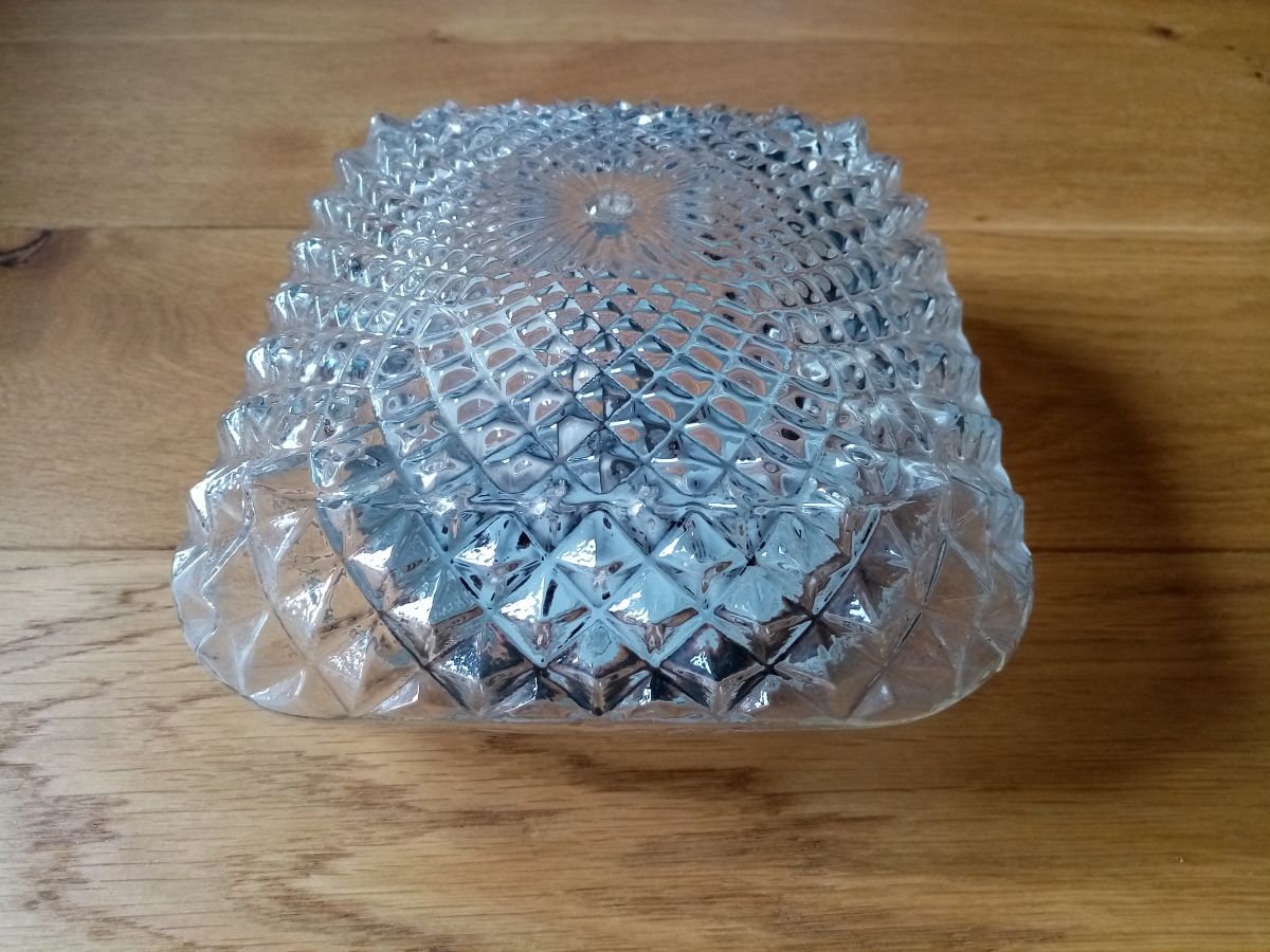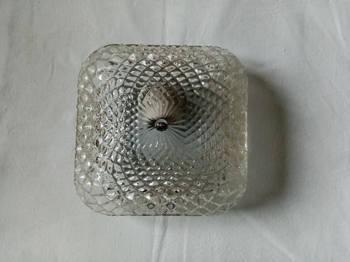 Charmante applique ou plafonnier en verre moulé, de forme carrée, avec un décor de pyramides organisées autour d'une « fleur » centrale. Je la voie bien sur un mur, accompagnée de plusieurs autres, un peu à la façon de l'accumulation de paniers plats. Elle est munie de son socle en métal peint en noir, percé de plusieurs trois trous pour la fixer au mur ( vis et chevilles non comprises) et de sa douille en céramique (pour ampoule à gros culot). Elle est à recâbler, et peut-être changer la douille que je n'ai pas testée. La partie en verre se fixe sur le socle grâce à 3 petites vis. Le verre est intacte, le socle présente quelques points de rouille superficielle. Elle mesure 18 cm de côté, pour 9 cm de hauteur (socle compris). Elle pèse 800 g.