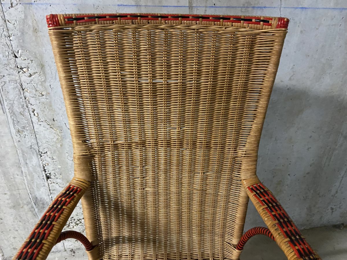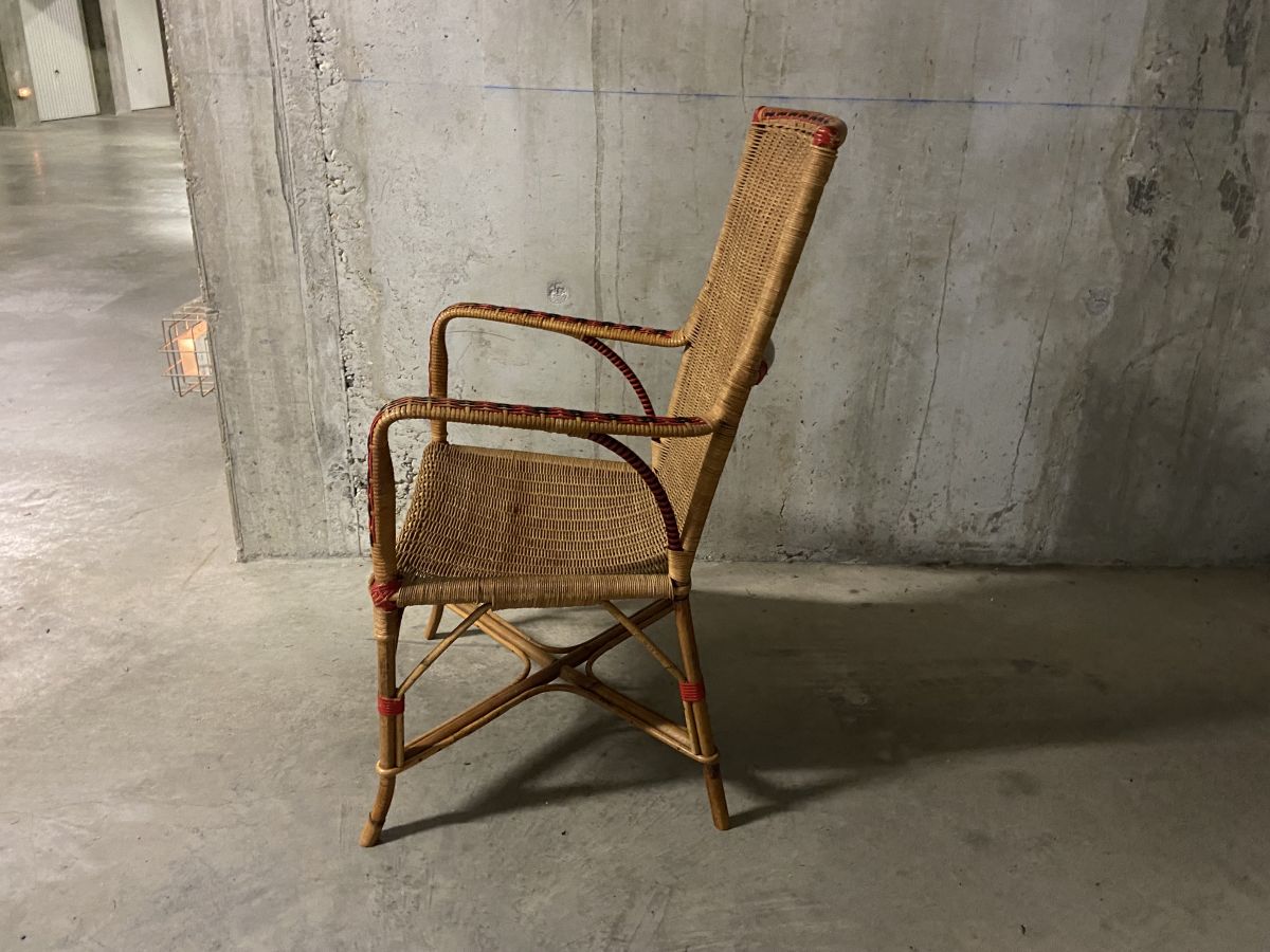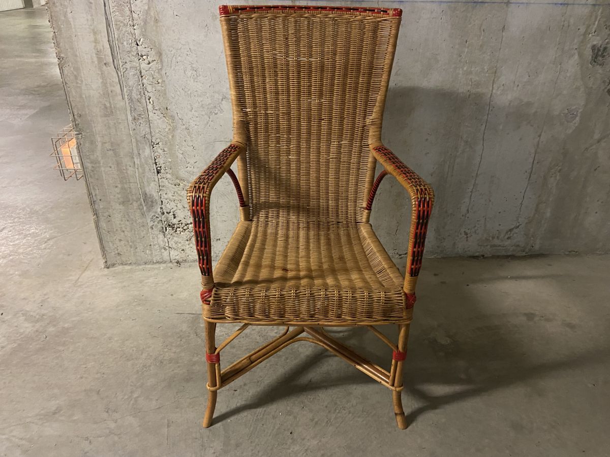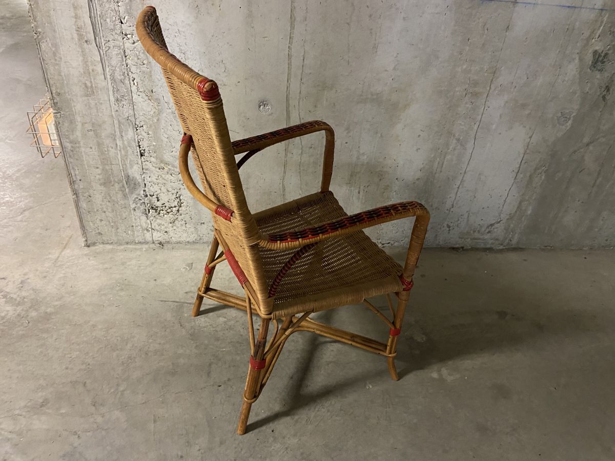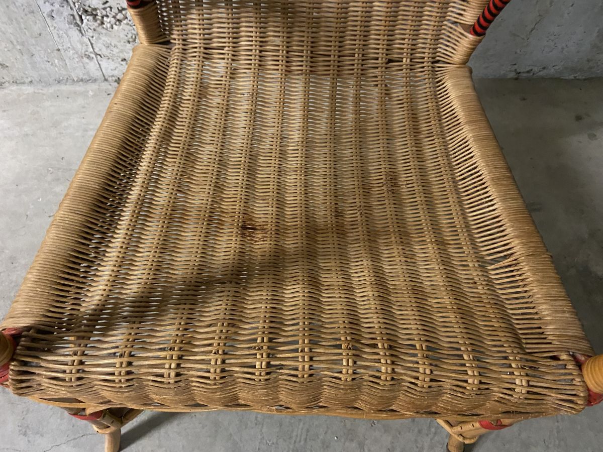 Fauteuil en rotin des années 60, quelques manques (voir photos) et marques usuelles lui conférant tout son charme, hauteur 100cm, largeur totale 55cm, profondeur totale 55cm, assise 42x38cm, hauteur assise 42cm.