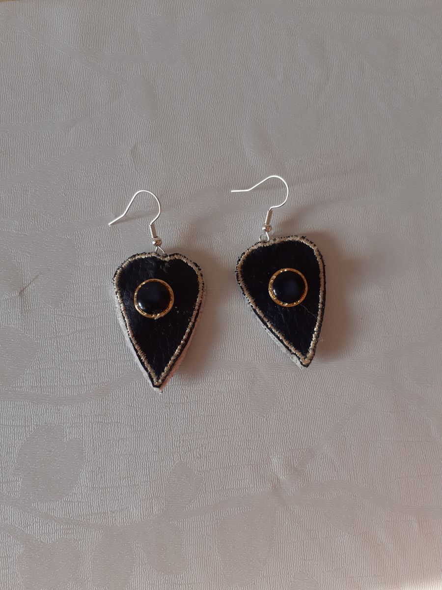 Boucle d'oreille en tissu skaï bleu marine contour brodé ,au milieu un bouton cousu