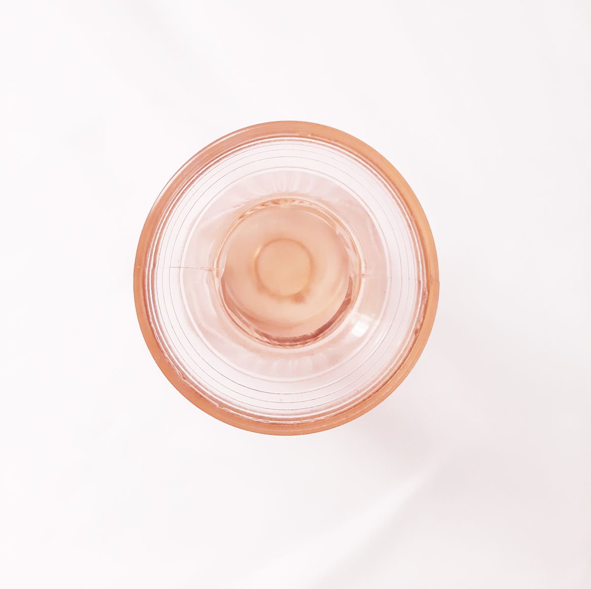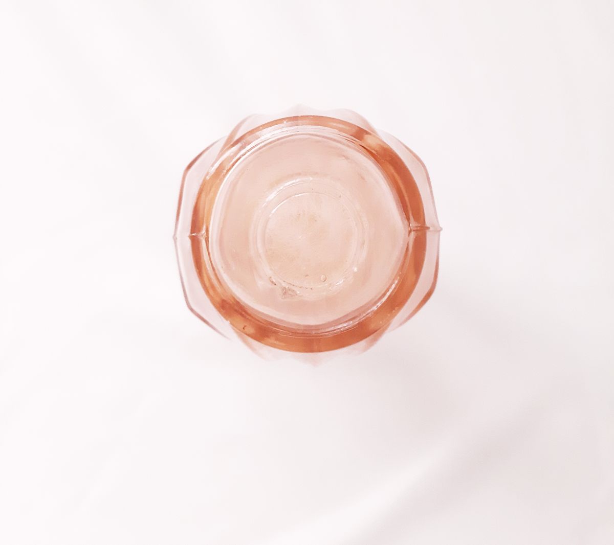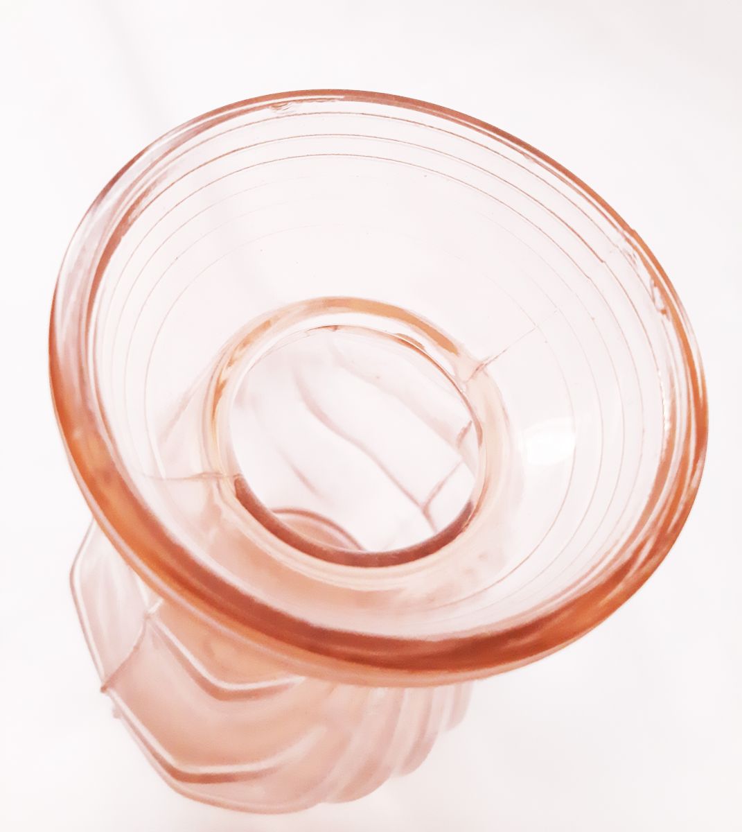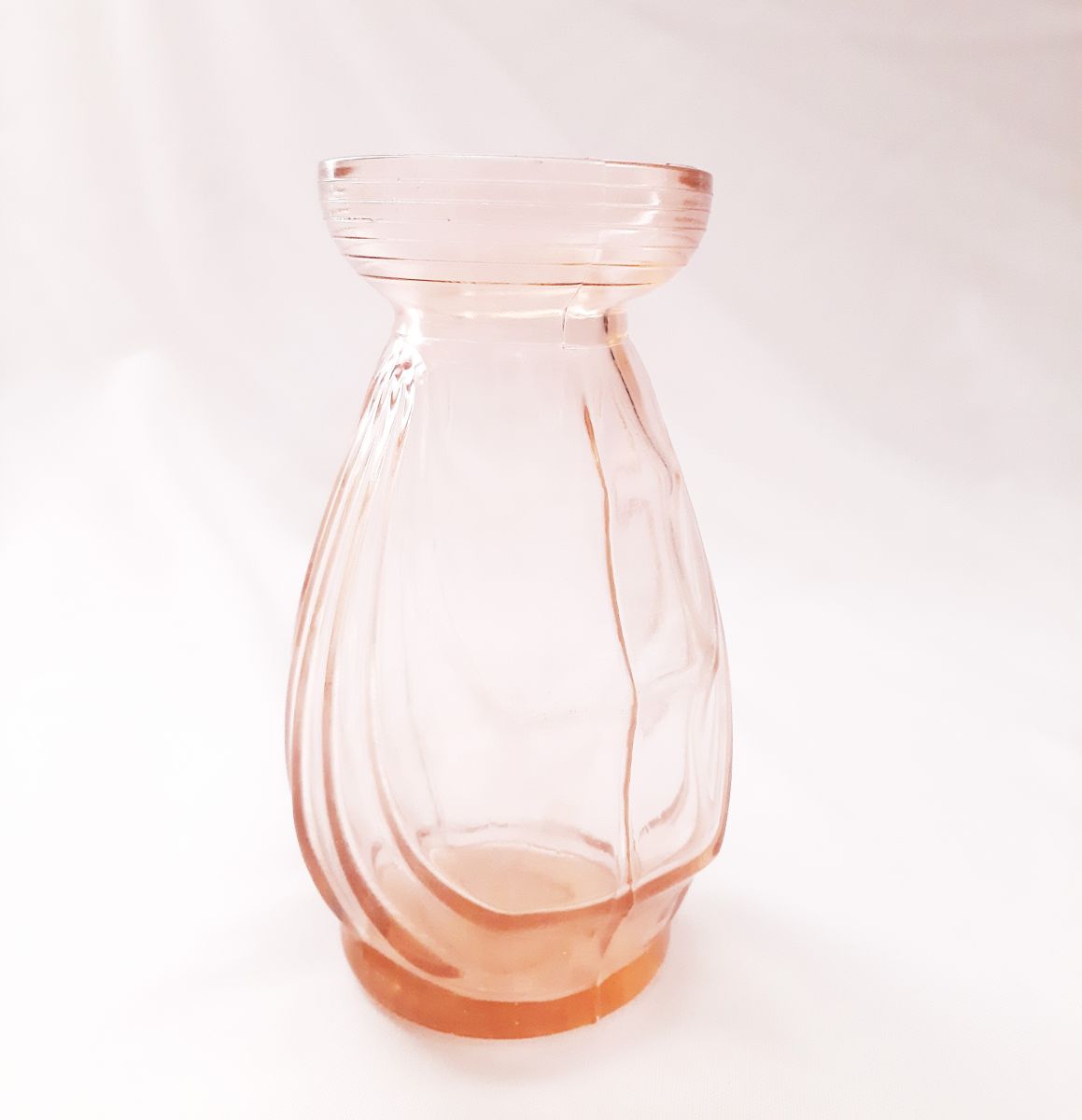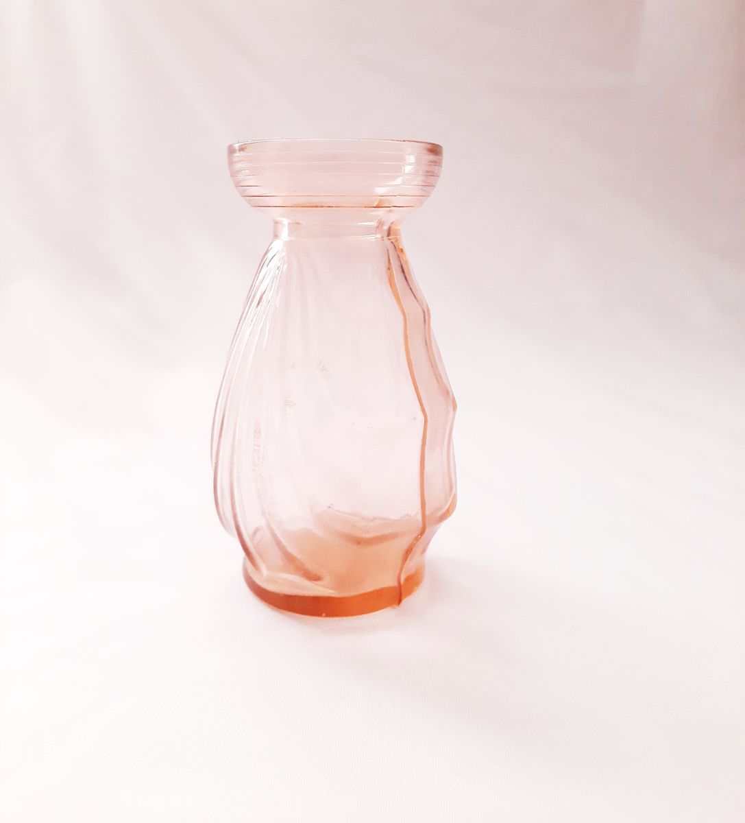 Petit vase vintage, élégant, en forme de robe, style art deco rétro, coloris vieux rose transparent. Dimensions: Diamètre maximum 8cm. Hauteur: 15 cm.