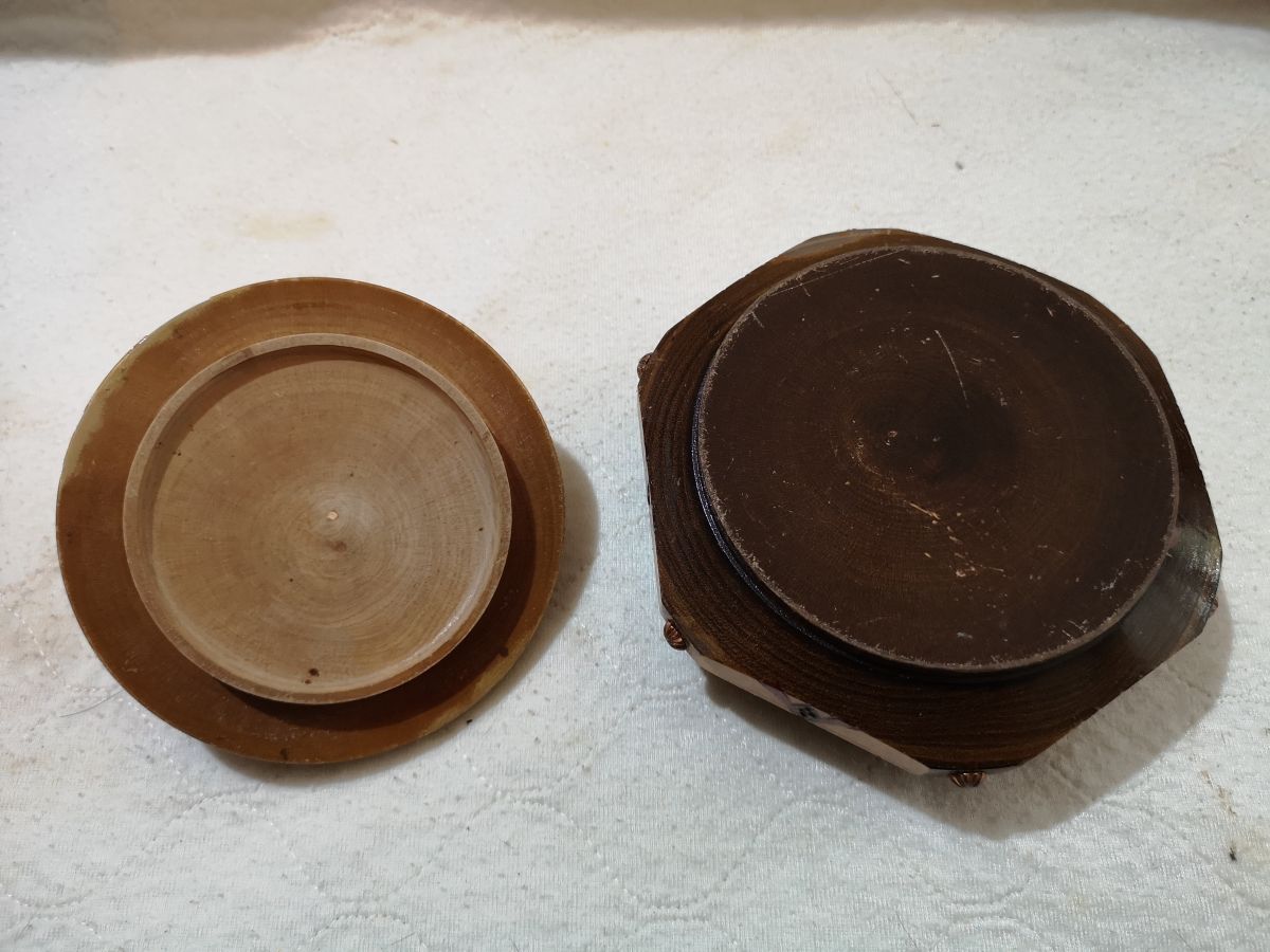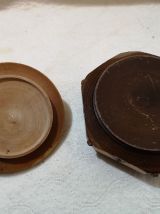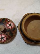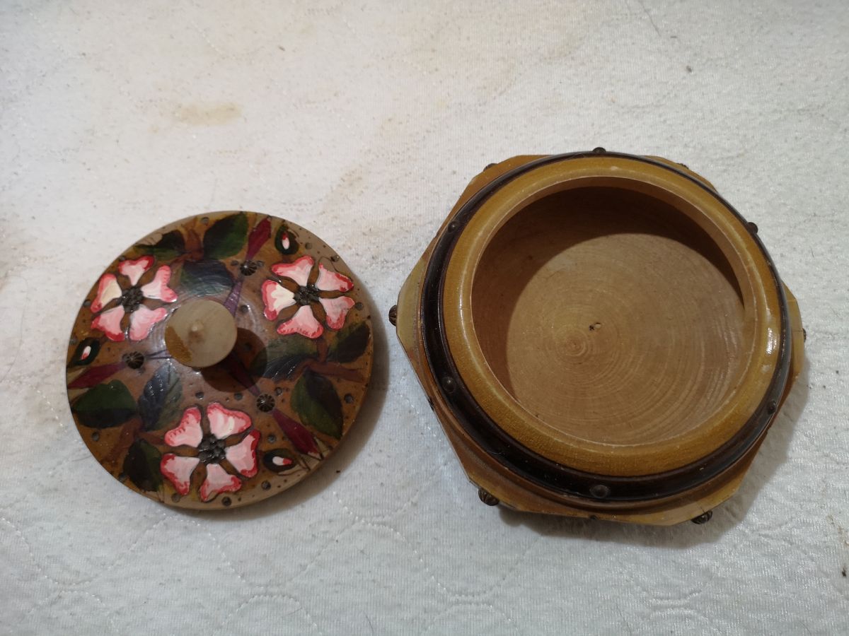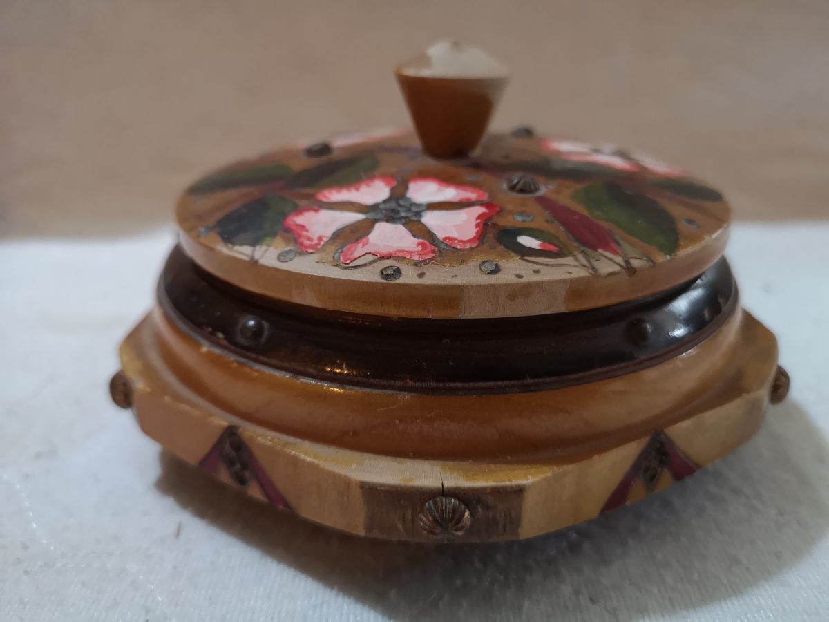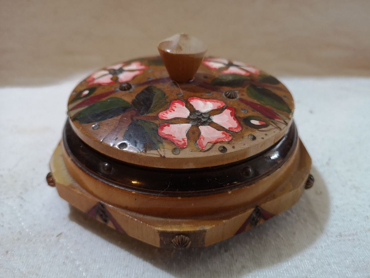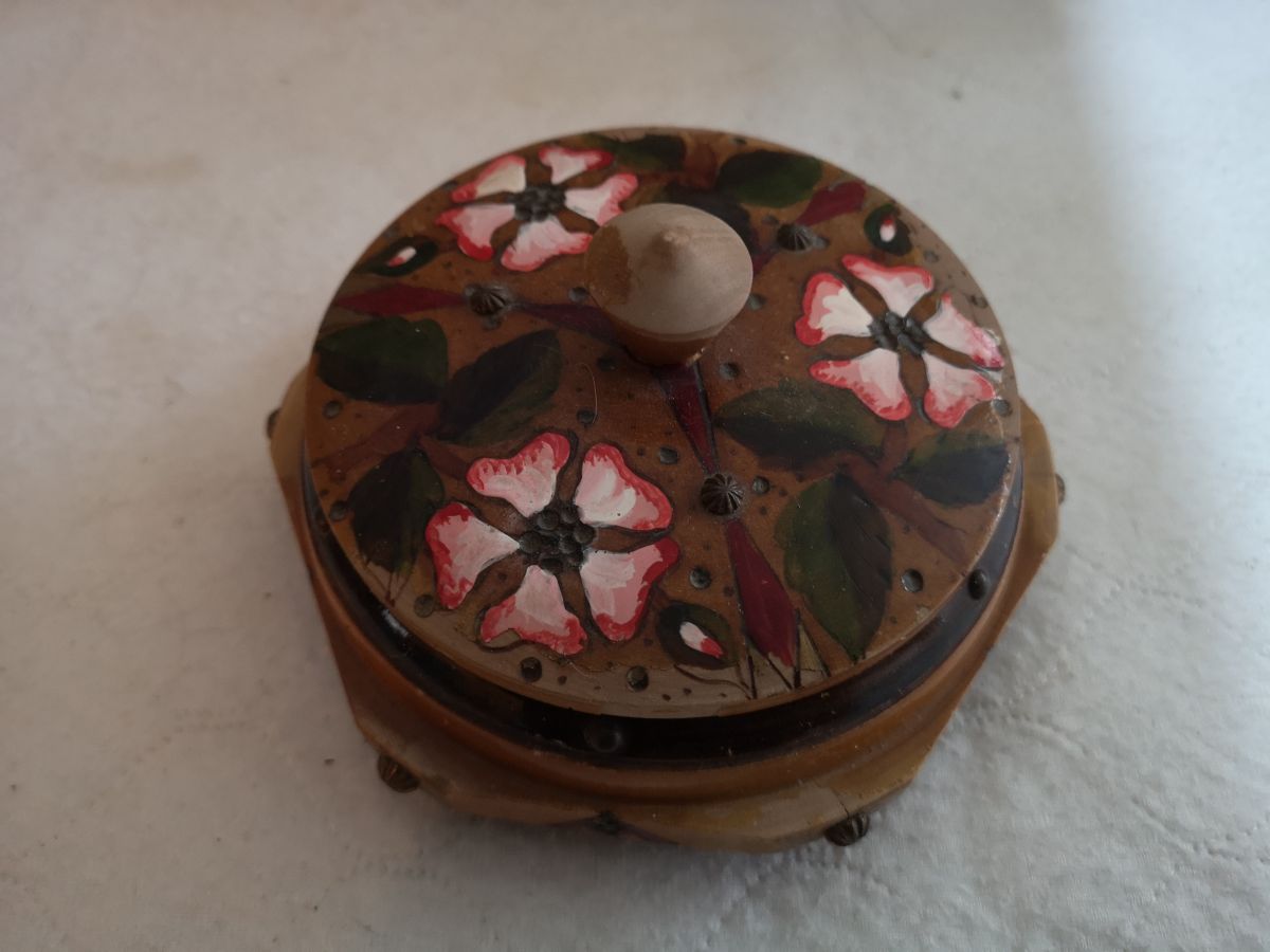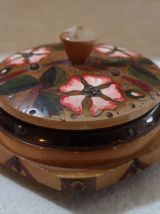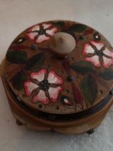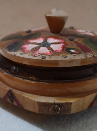ancienne boite à bijoux en bois peinte à décor de Fleurs et contour sculpté cloutages cuivrés