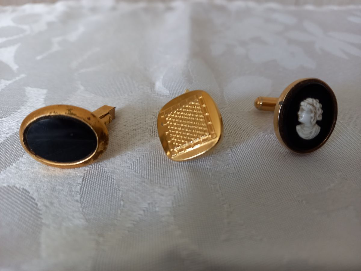 J’offre avec le lot 3 boutons de manchette « orphelins » (cf photo) dont un avec poinçon (forme ovale pierre noire)
