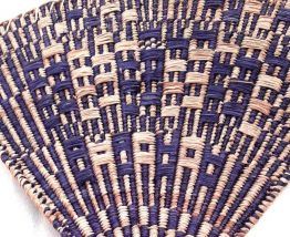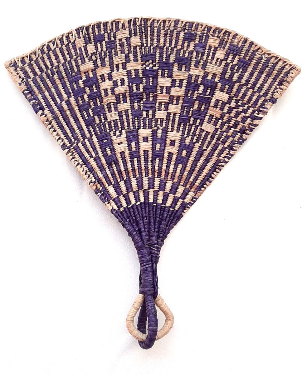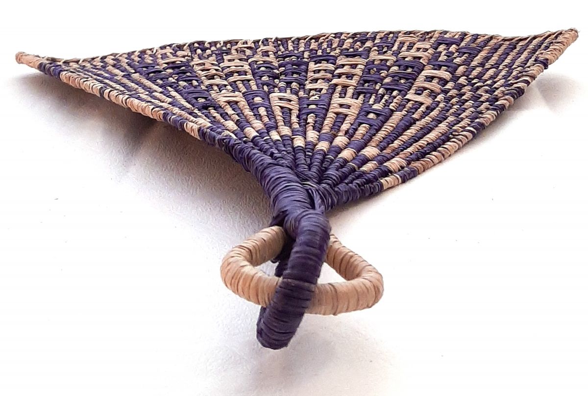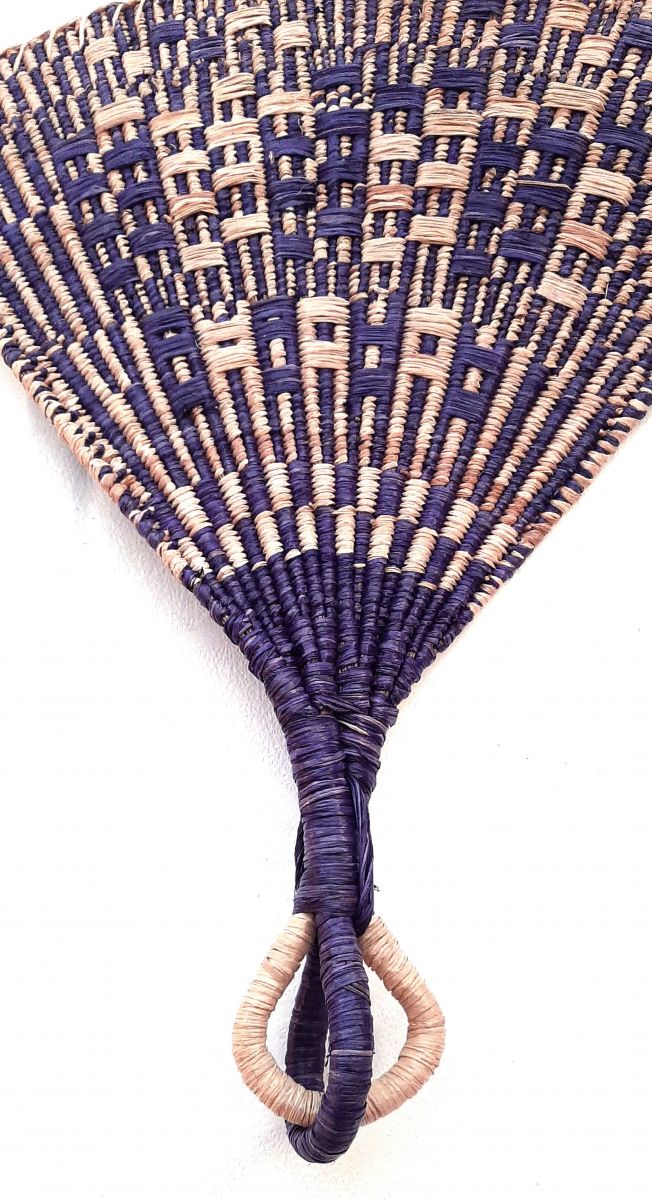 Cette éventail tissé à la main a été fabriqué au togo, en afrique. Forme triangle. Il est fait avec des fibres végétales couleurs naturelle et teintés organiquement en violet. Eventail idéal dans une décoration bohème chic ou ethnique. Vous pouvez l'accrocher au mur, l'encadrer ou le suspendre. Dimensions: épaisseur 5 cm, longueur 39cm largeur 32cm.