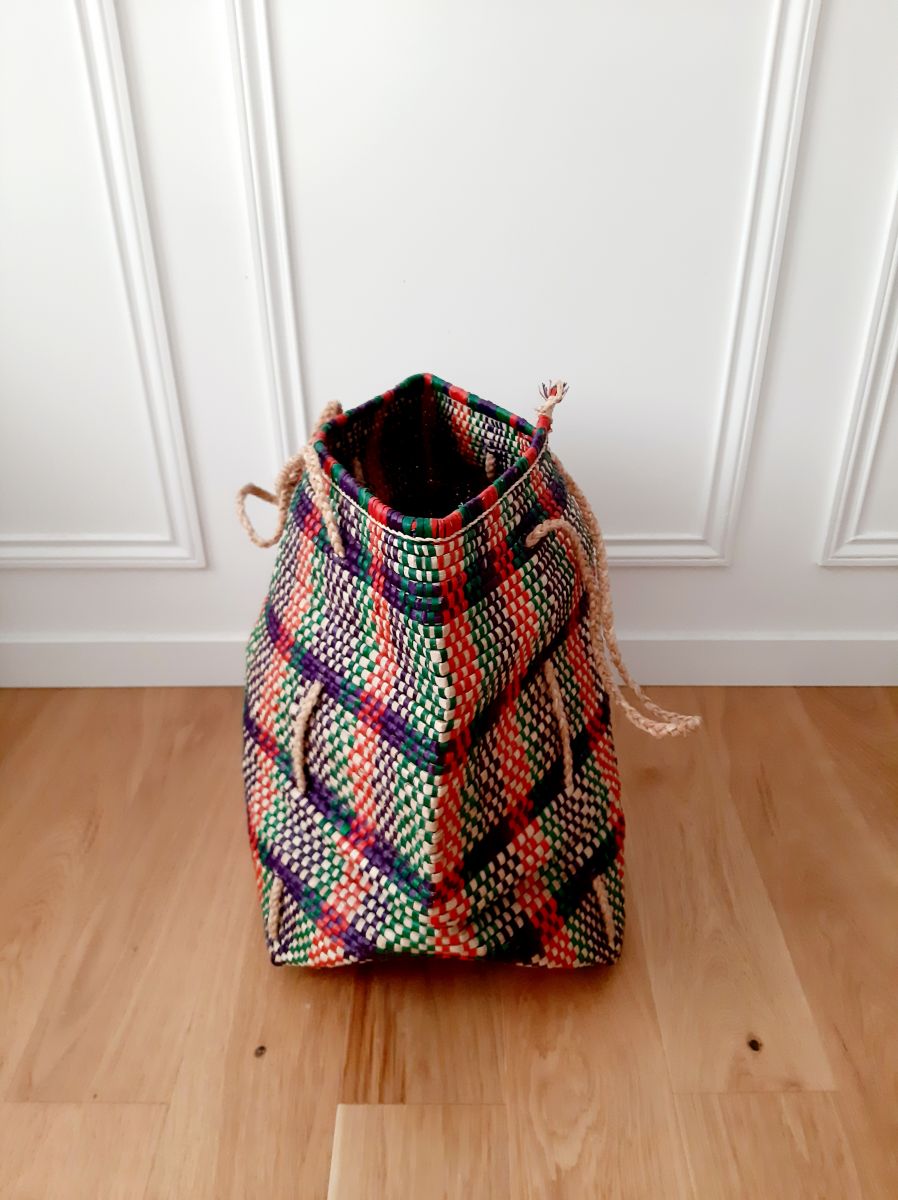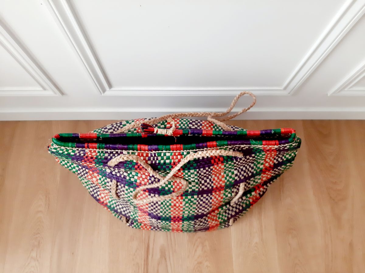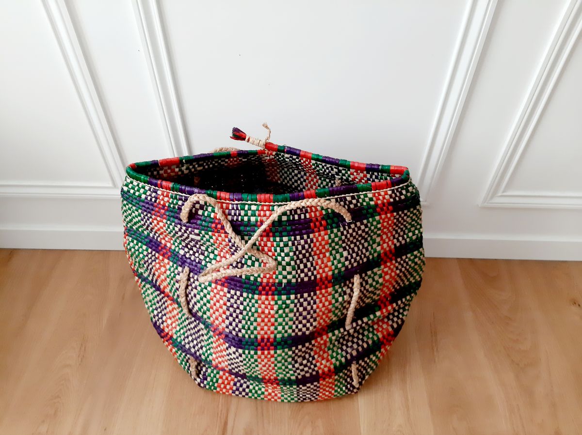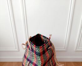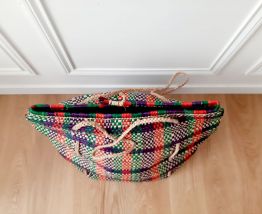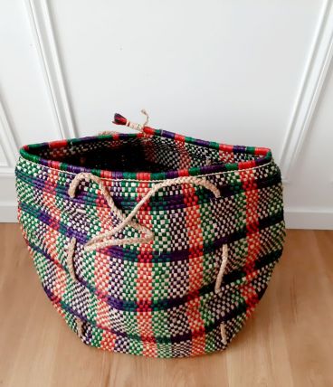 Très Joli panier tressé à la main en fibre végétale couleur naturelle, rouge, vert violet . Tissé au Ghana, avec des fibres végétale épaisse, en couleur naturelle et teinté, les paniers ont une forme unique et originale.